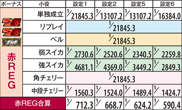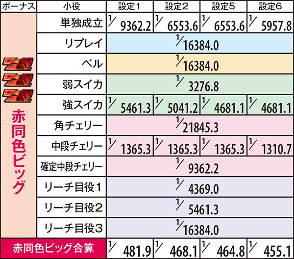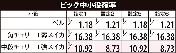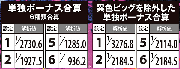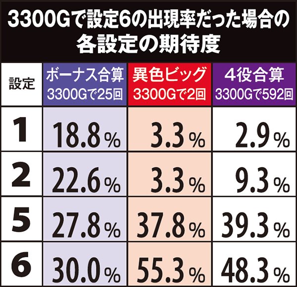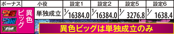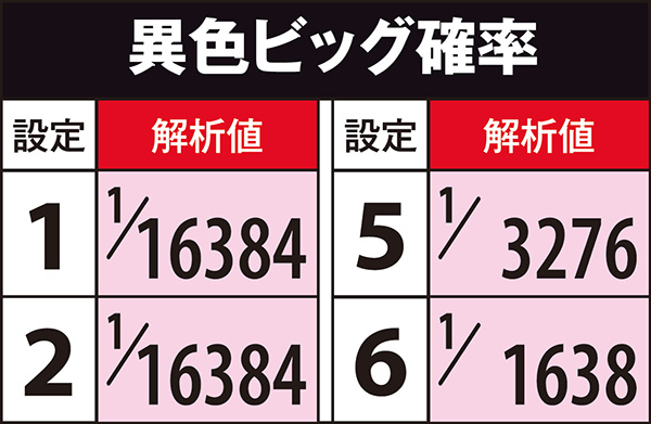 異色ビッグは、設定1&2の16384分の1に対して設定5だと3276分の1(5倍)、設定6なら1638分の1(10倍)の出現率となる。その差はまさに歴然。複数回出れば高設定濃厚だ。