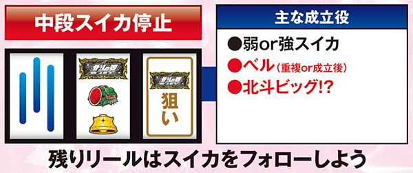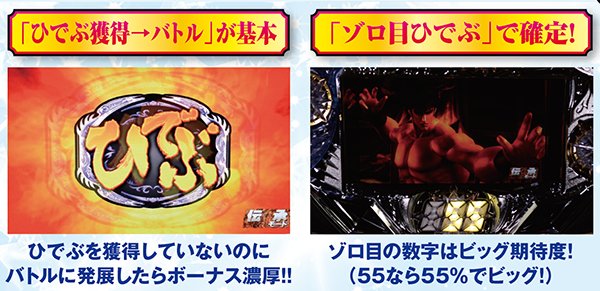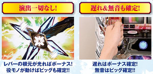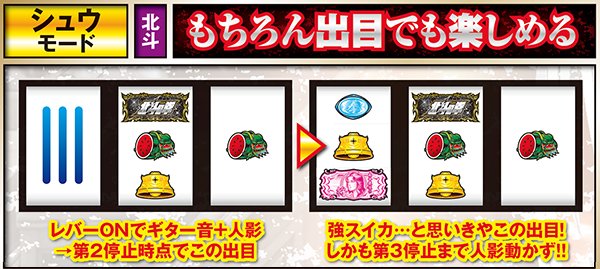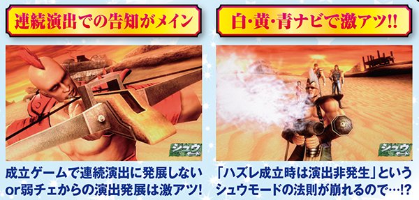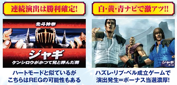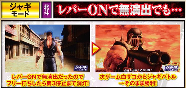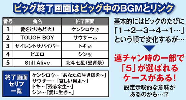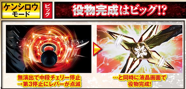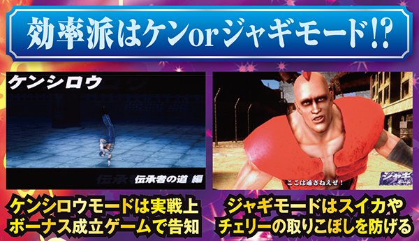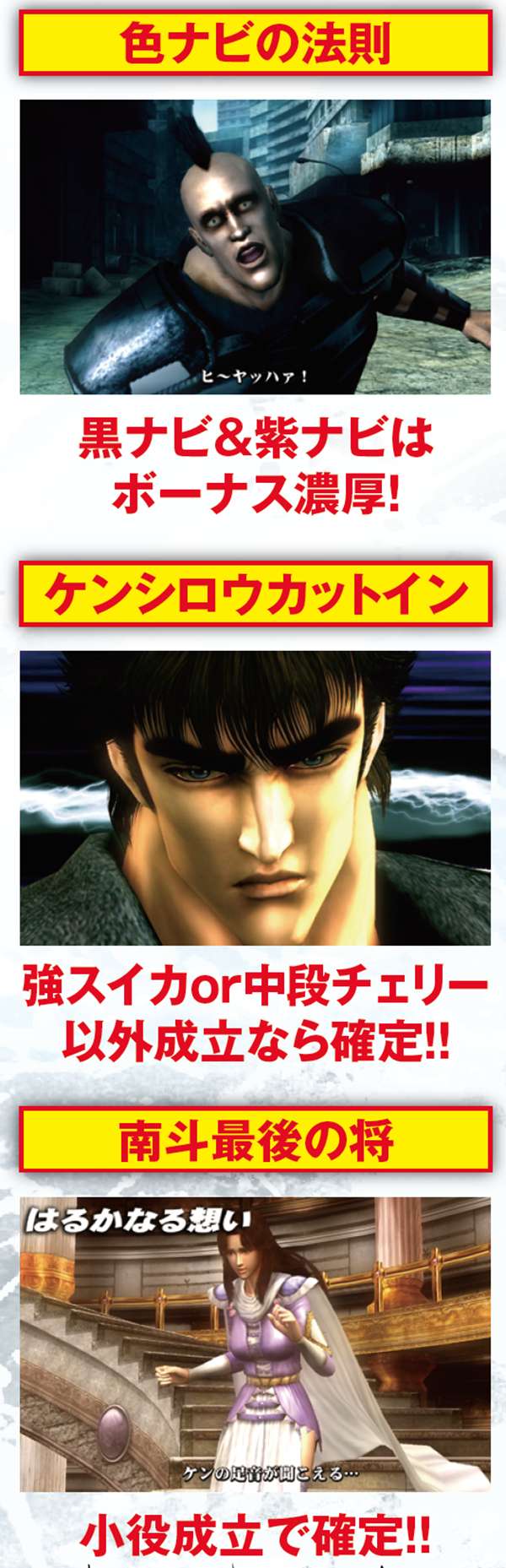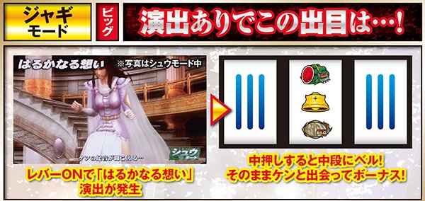 液晶画面上での演出が一切しないケンシロウモードは、成立ゲームで必ず告知が発生するのでボーナス察知には有利。告知時の役物作動はビッグ確定、遅れはボーナス濃厚、無音はビッグ濃厚となる。