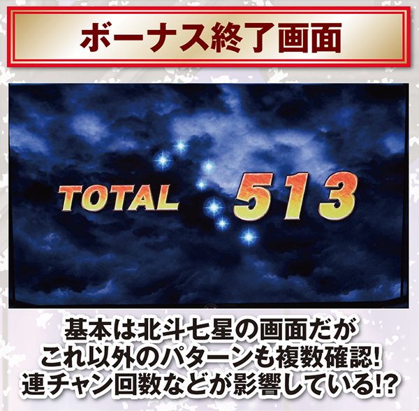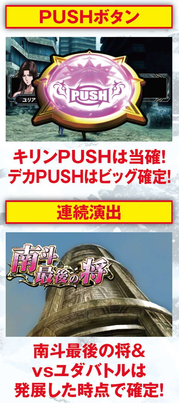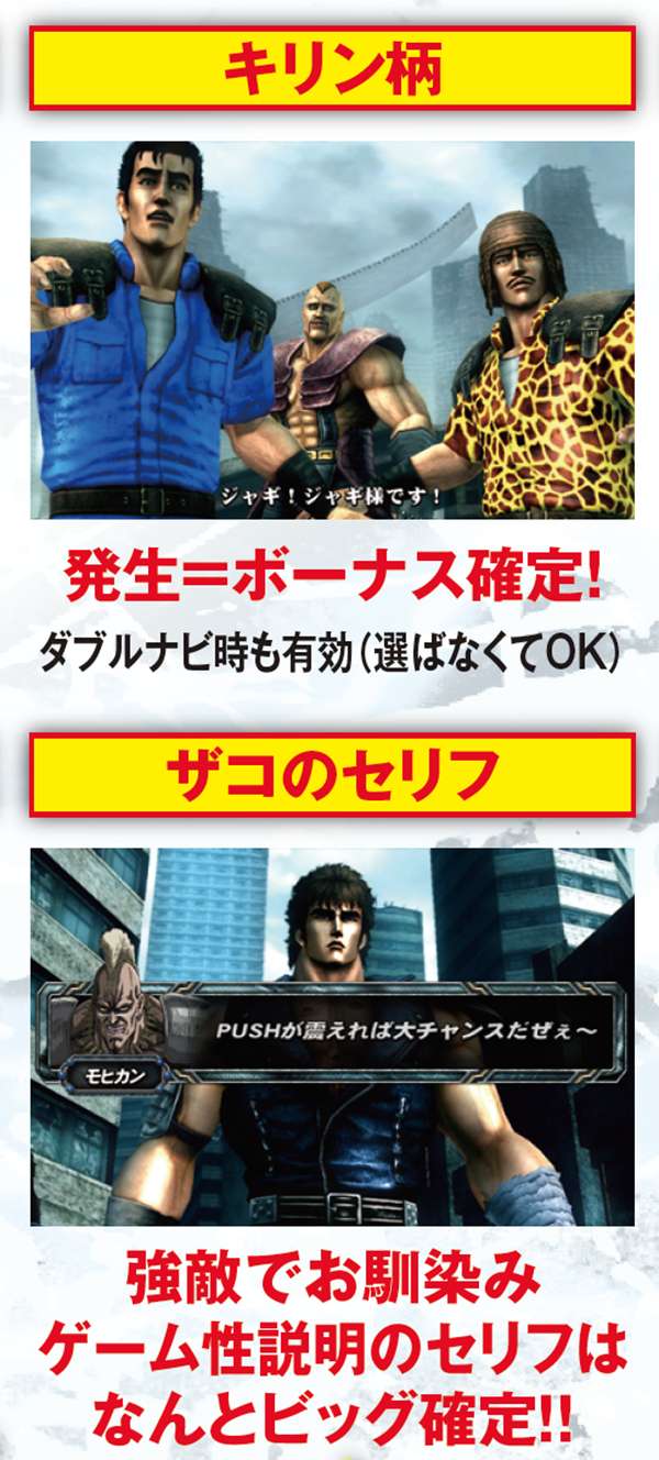 ボーナス察知の遅れはコインロスにつながるので、本機では素早いフラグ察知が必須となる。そのために覚えておきたい演出が上記のもので、たとえばPUSHのキリン柄はボーナス確定、デカPUSHならビッグ確定。このほか、比較的よく見る「南斗最後の将」は小役成立で確定…といったあたりも要チェックだ。