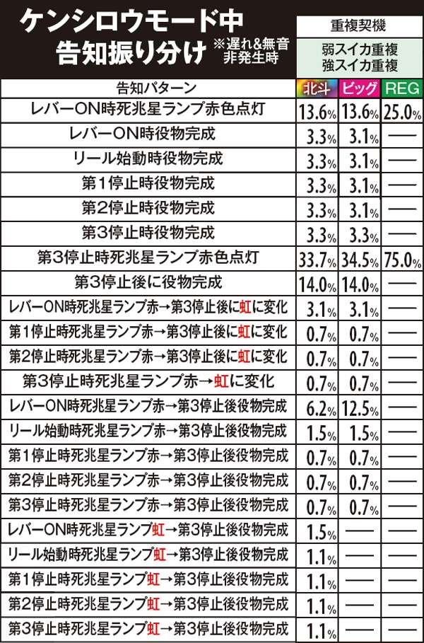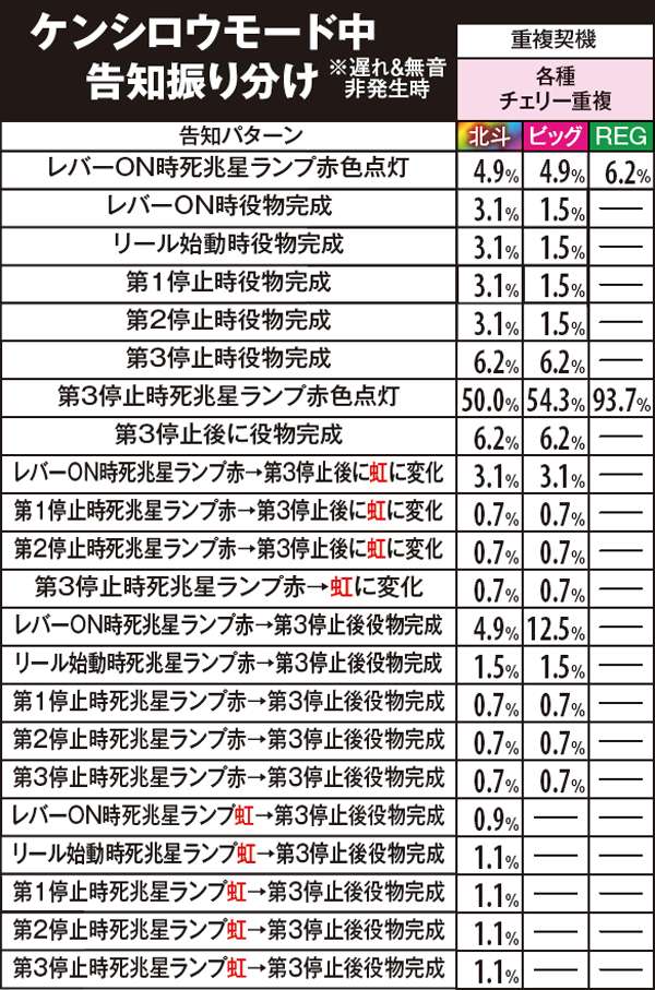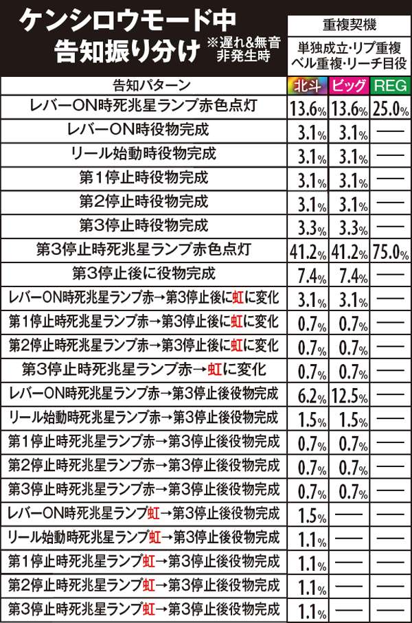 完全告知の「ケンシロウモード」における告知タイミングは、レバーON時から第3停止時まで上記の振り分けとなっている。REGの場合は2種類のパターンしか存在していないので、それ以外のパターン発生はビッグ以上が確定。ランプの点灯が「赤から虹に変化」ではなく「いきなり虹」だった場合は、すべて北斗ビッグ確定だ。