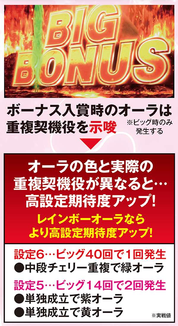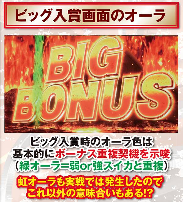 ビッグ入賞画面で確認できるオーラの色は、基本的にボーナス重複契機を示している。ただし、これは完全リンクではないようで、何か別の意味もあるかも…。REG中のキャラ紹介画面は、設定示唆の役割を担っている可能性大。ボーナス終了画面にも秘密がありそうだ。