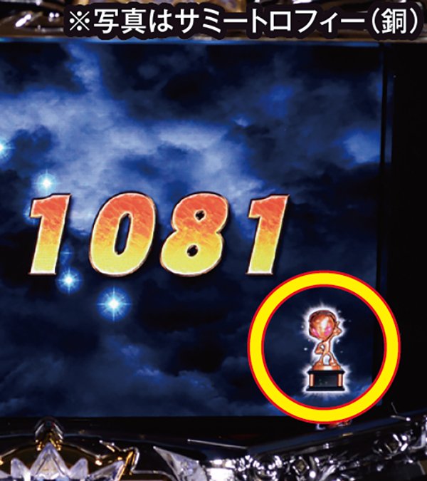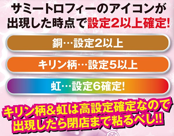 設定示唆に関しては非常にわかりやすいパターンが用意されており、ボーナス終了画面(右下)にサミートロフィーが表示されると、その時点で設定2以上確定(=設定1否定)となる。キリン柄なら設定5以上、虹は設定6確定!