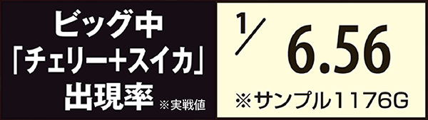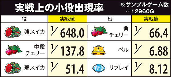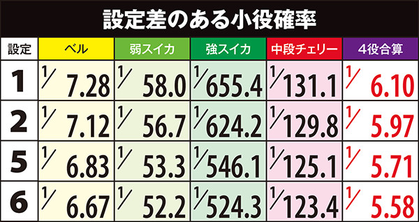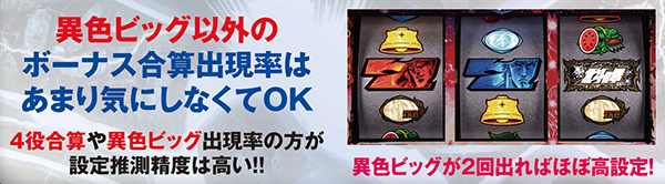 設定差のある4役は、個別よりも合算でカウントする方が設定推測制度はアップする。合算確率の差は一見たいしたことないが、確率が高い(=サンプルが得やすい)ため、重要度的には異色ビッグ出現率と同等だ。