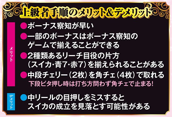 中押し青7狙い時の最大のメリットは「ボーナス察知が早い&察知ゲームで揃えられる割合が多い」こと。リーチ目役を奪取したり、中段チェリーを角チェで取るのは面倒&高難度だが、ボーナス察知が早いだけでも大幅なコインロス防止になるので、アツい演出が発生した時などはこの打ち方がオススメだ。
