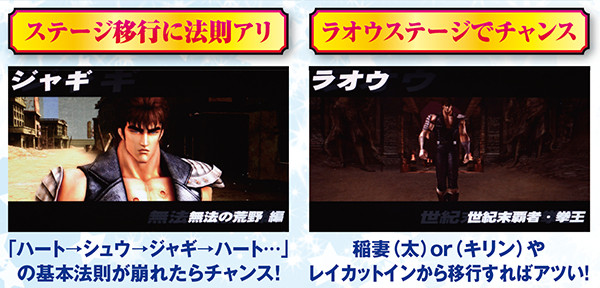 基本はハート→シュウ→ジャギのループで、ラオウステージへの移行はハイチャンス。ループの法則が崩れたり、ステージチェンジ時の稲妻が「大」、あるいは「キリン柄」といったケースも激アツだ。
