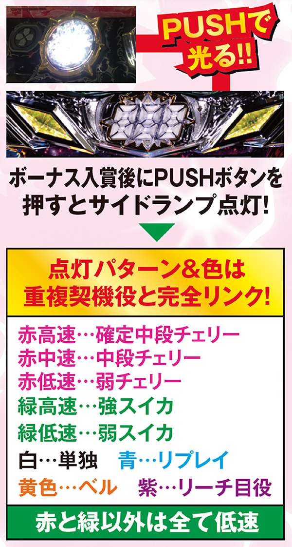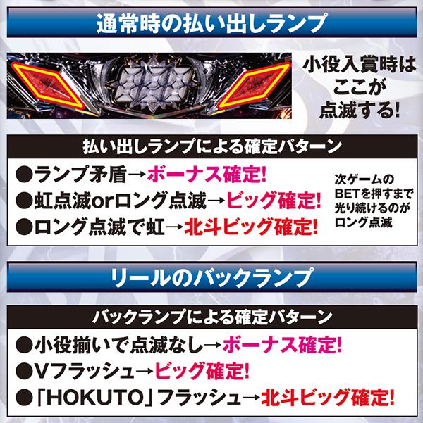 ランプの色矛盾(チェリー成立なのに赤以外など)は、発生=ボーナス確定。虹点滅やロング点滅ではビッグ確定となる。このほか、小役揃い→バックライトの点滅なしでボーナス確定、同じくバックライトの「V」でビッグ確定も覚えておこう。