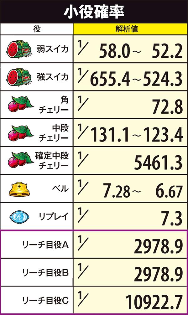 連続演出をメインとしているシュウモードでは、弱チェリー以外のチャンス役でほぼ連続演出発展となる。スイカ→緑ザコ倒す(=連続演出に発展しない)→発展しないので確定…といった衝撃も。