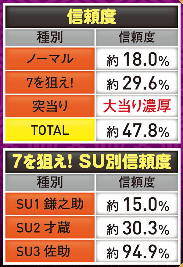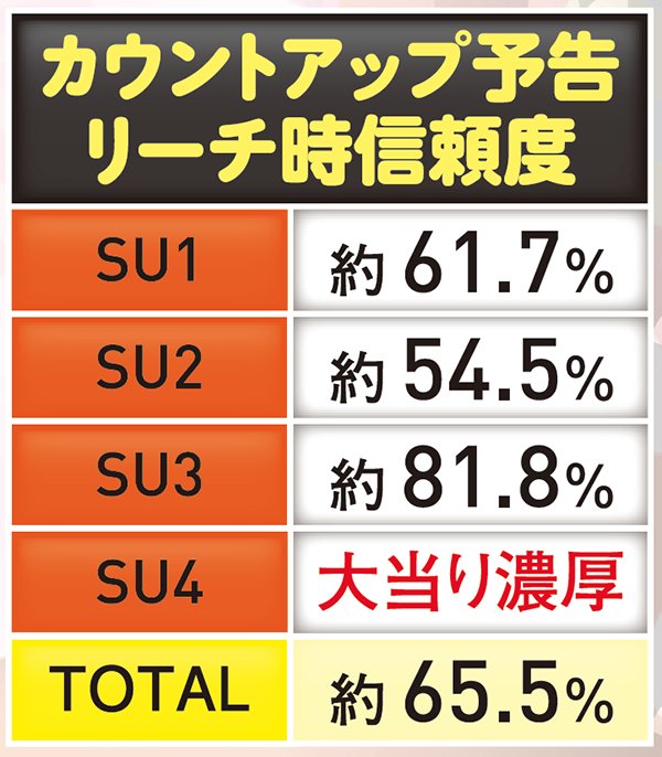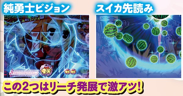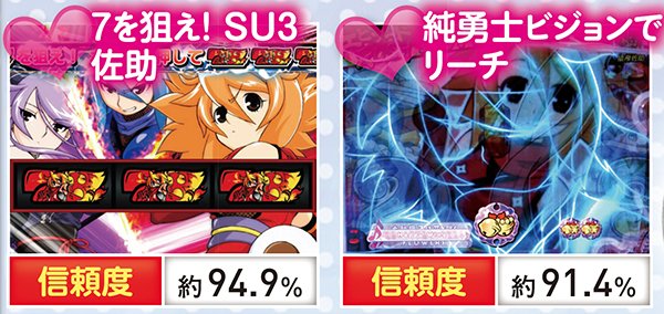 先読み予告は連続するほどチャンス。夜背景になったり、純勇士ビジョンやスイカ先読みでリーチになれば激アツだ。また、カットインともに純勇士が数字を数えるカウントアップ予告のSU3以上もアツい。