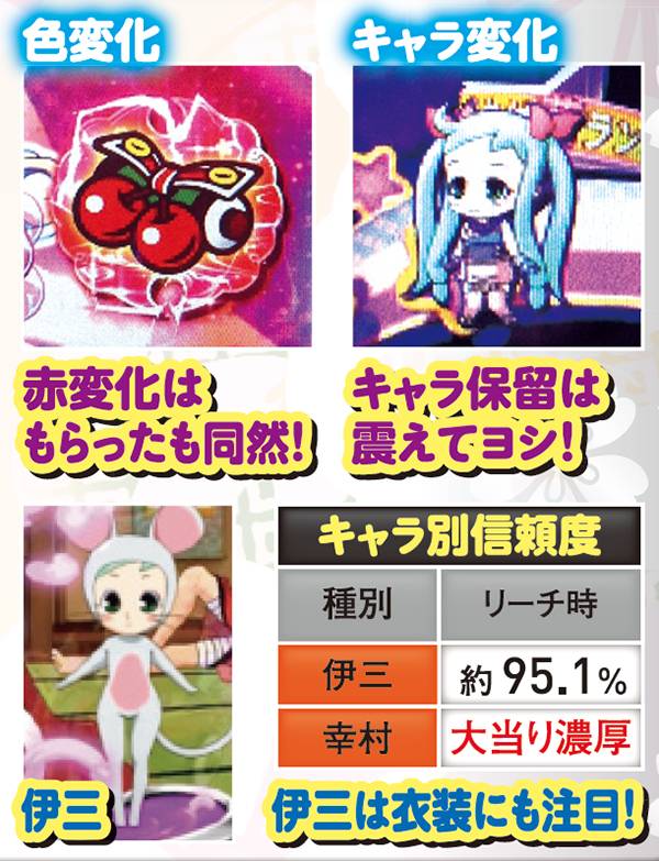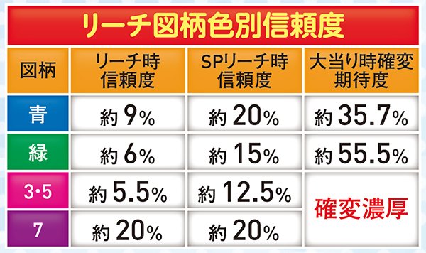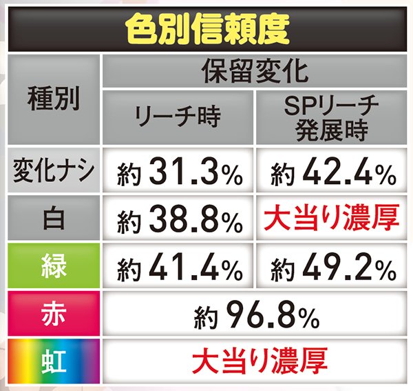 保留変化は緑以上に期待。赤なら大当りはもらったも同然だ。また、保留がキャラに変化した場合も激アツとなる。