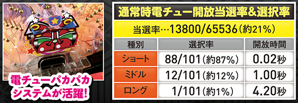 | 確変突入率 | 50%/30回転まで(ヘソ) 100%/30回転まで(電チュー) |
