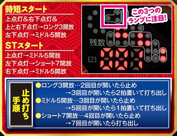 最初から時短の場合と、STからスタートする場合で電チュー開放パターンが異なるようです。手順は多少複雑ですが、2個戻しのため、止め打ちを実戦しないと玉減りは避けられません。