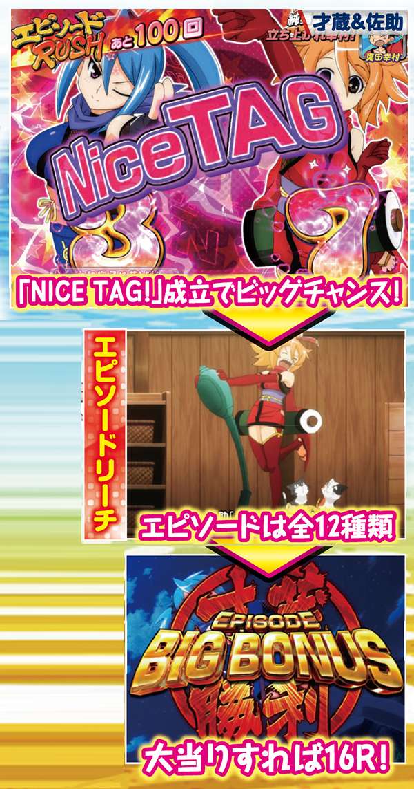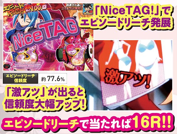 図柄停止時に「NiceTAG!」成立でRUSH中の最強演出エピソードリーチに発展。ひとつでもチャンスアップが出れば激アツだ!