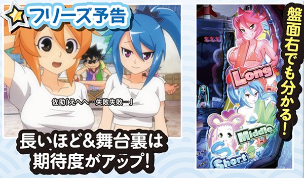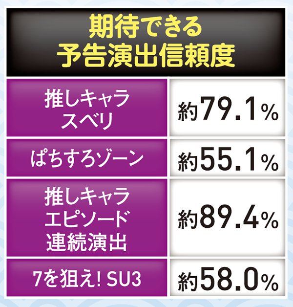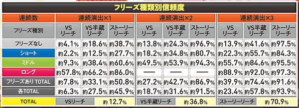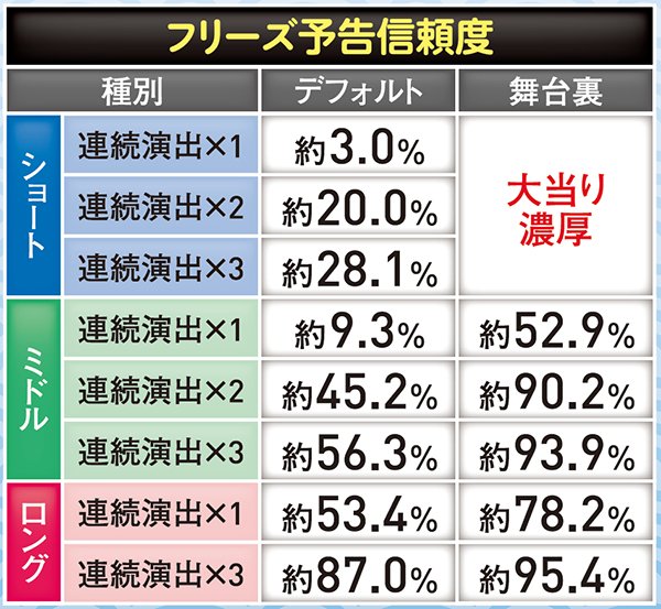 フリーズは長くなるほどアツく、舞台裏ならさらに期待度がアップ。また、連続演出の継続数も重要で、3連続ならTOTAL信頼度は約70%と期待大だ。なお、舞台裏ショートは大当り濃厚という特徴もある。
