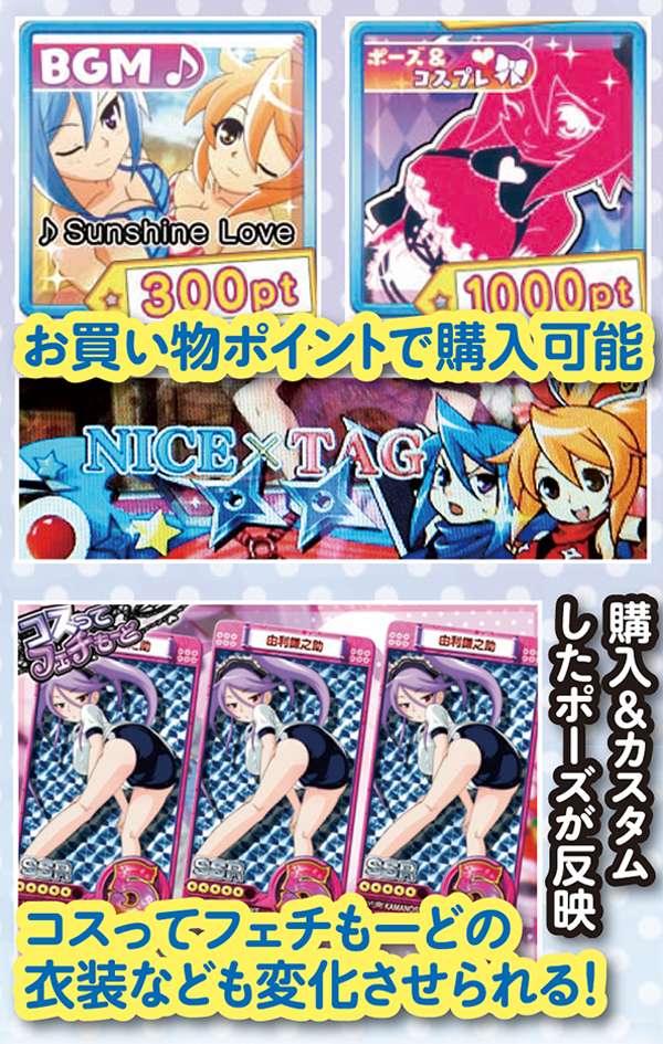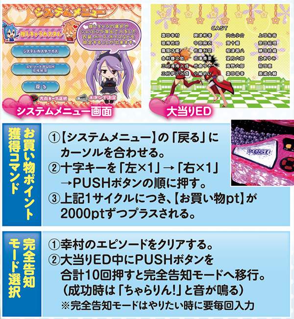 コスプレやポーズなどのカスタム機能をゲットするために「お買い物ポイント」は、システムメニューで隠しコマンドを入力すると何回でもゲット可能! 他にエピソードRUSHの完全告知モードを選べる隠しコマンドもある!
