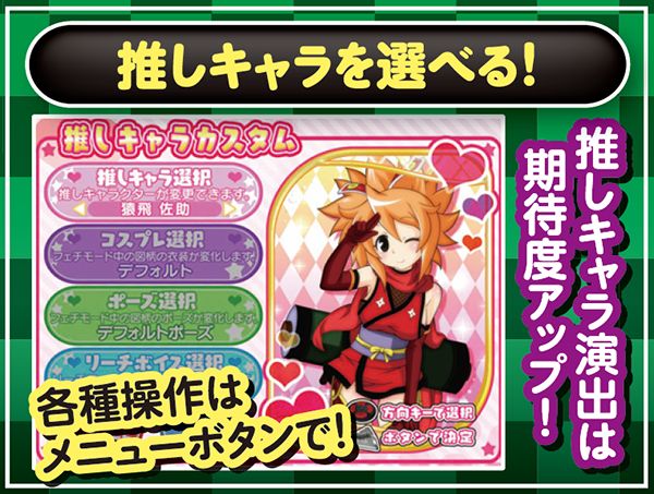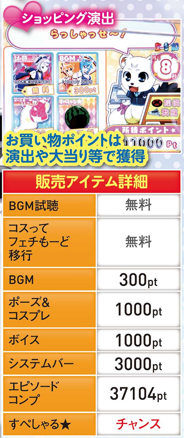 本機はカスタム機能も充実。演出信頼度にも関係してくる推しキャラ選択やアイテムで演出をカスタムすれば楽しさ倍増必至だ。