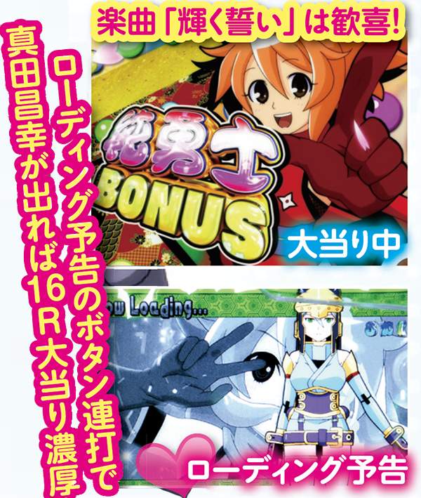 緊急連絡、会話、幸村登場などは赤色が絡めば激アツ。ローディング予告は、ボタン長押しで虹色キャラが出れば灼熱だ。