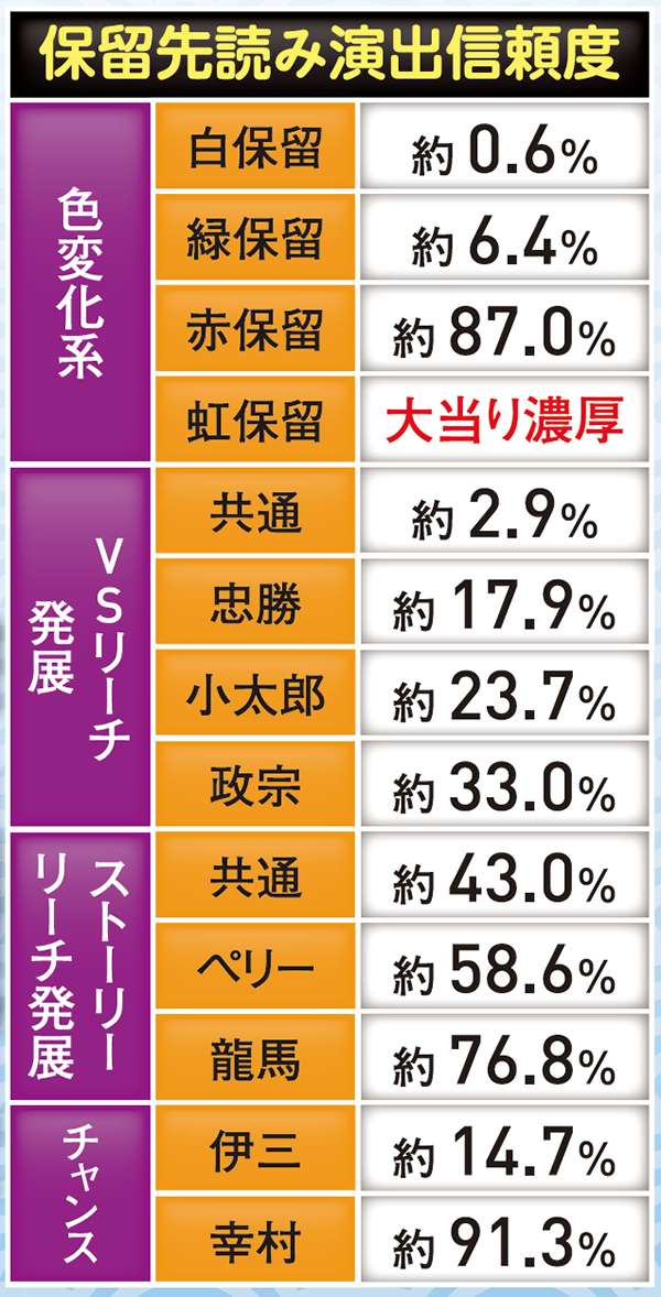 保留先読み演出は、色変化なら赤以上に期待。ストーリー発展系や幸村なら高信頼度だ。