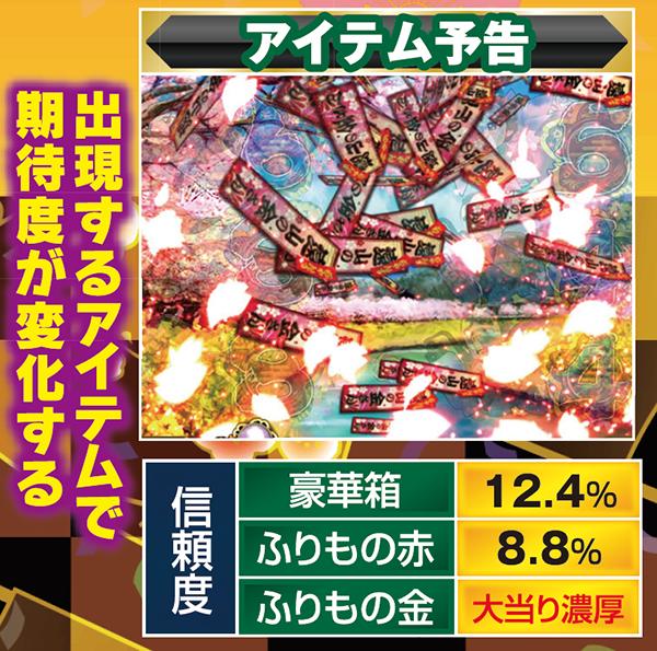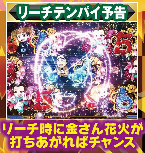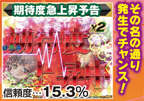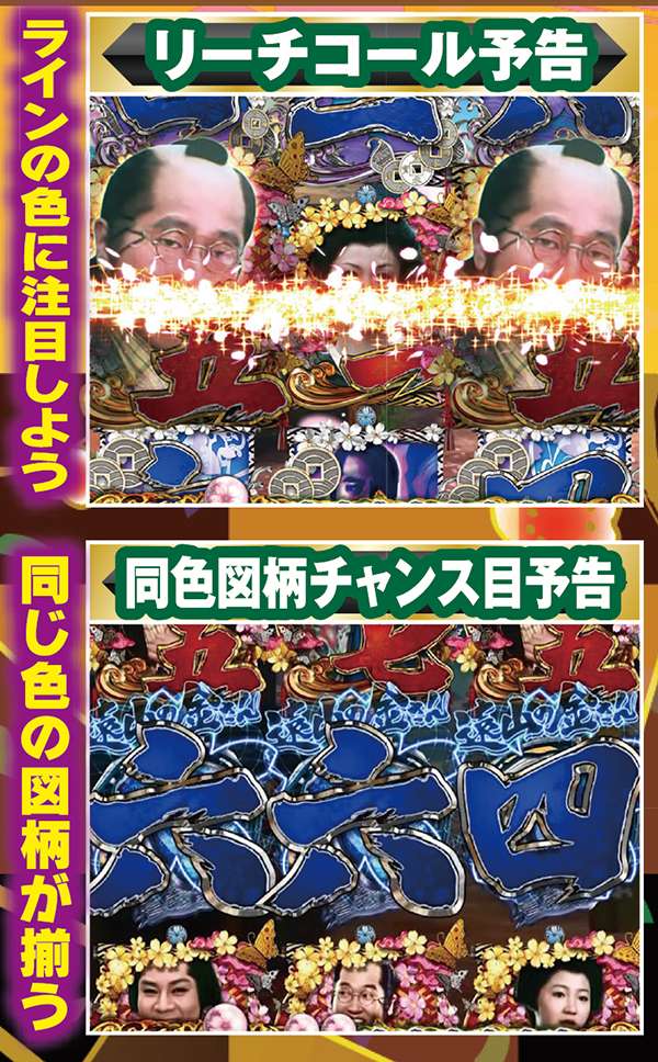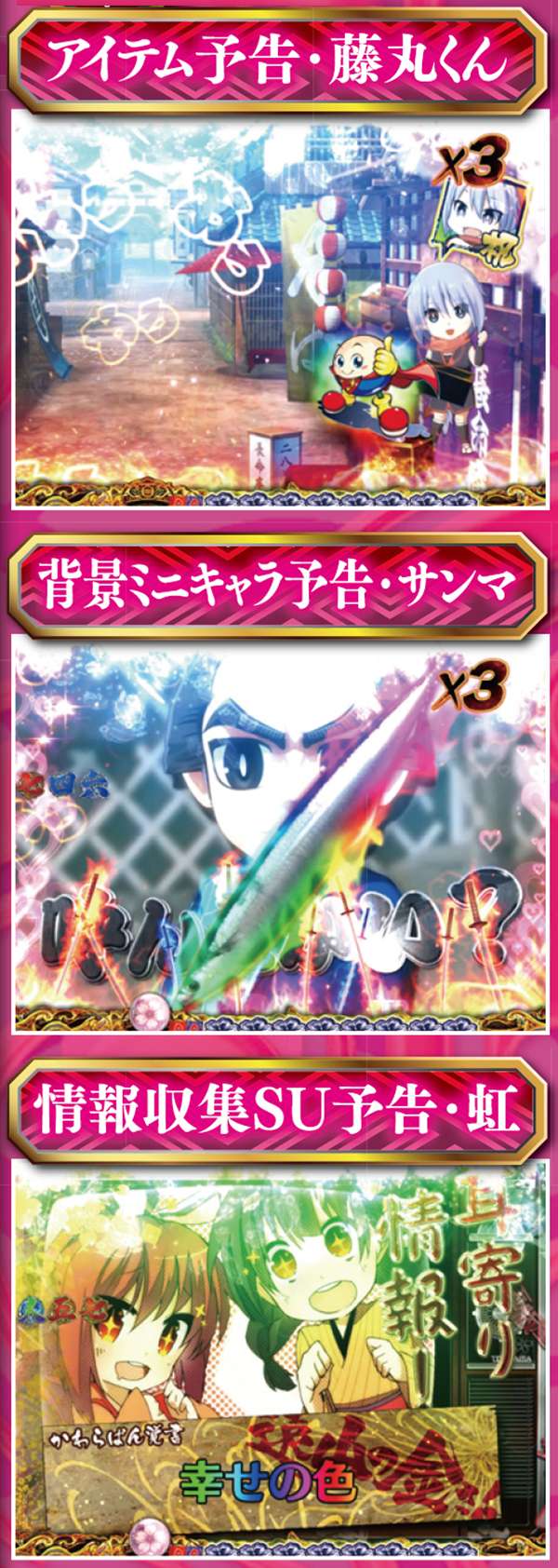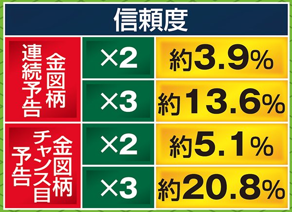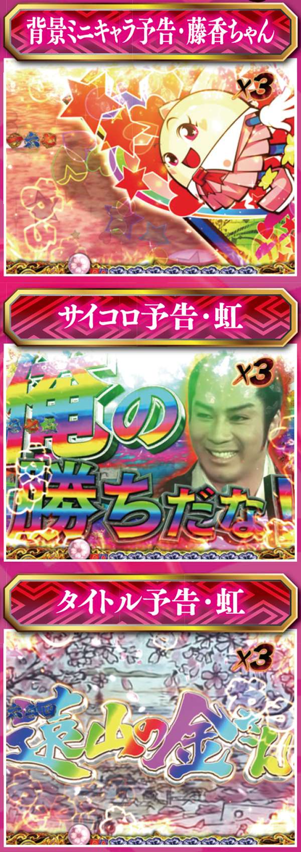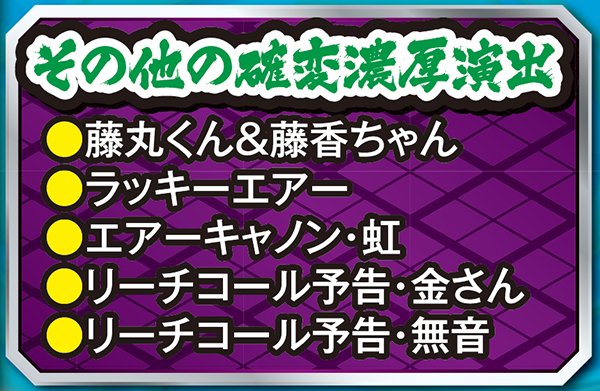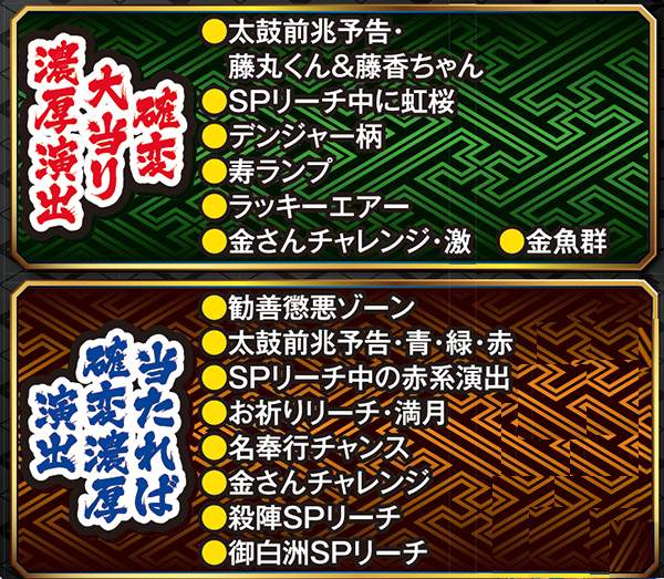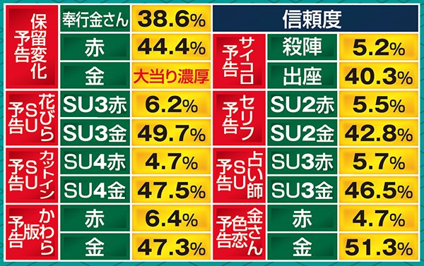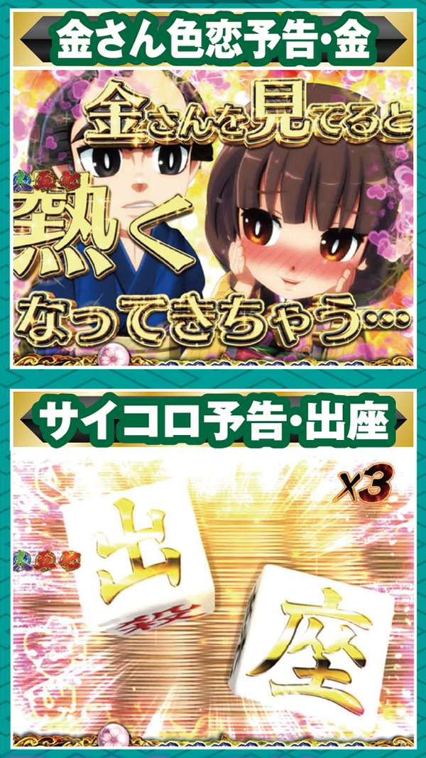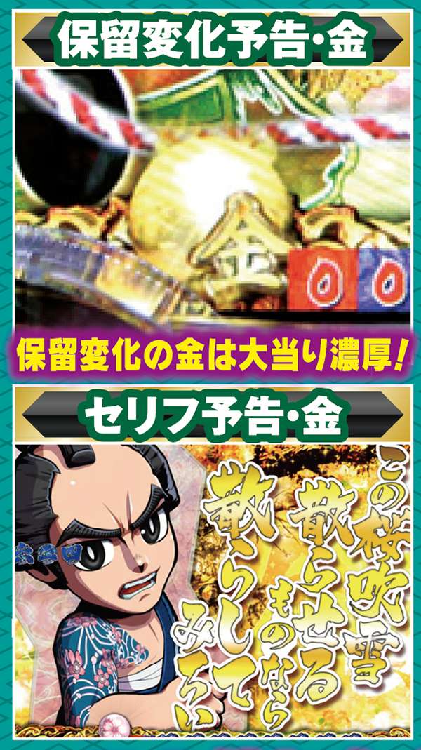 各種ステップアップやサイコロ、かわら版など様々な予告中に金色が出現すれば信頼度が40%オーバーにまでアップ。また、保留変化に限っては金色=大当り濃厚となるので覚えておこう。