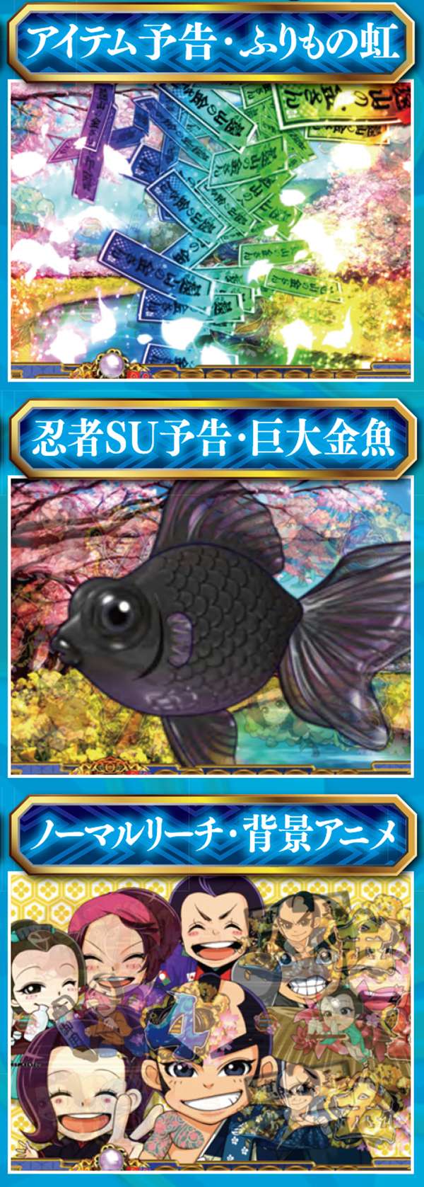 藤丸くんや虹といった定番パターン以外に金魚群の出目金やアイテム・忍者予告時に出現する巨大金魚など、金魚がらみのプレミアムも存在。リーチコールの無音のような意外なパターンもあるぞ。