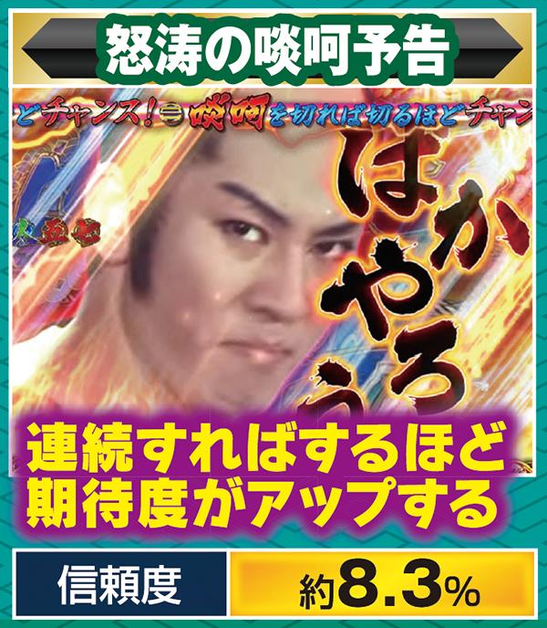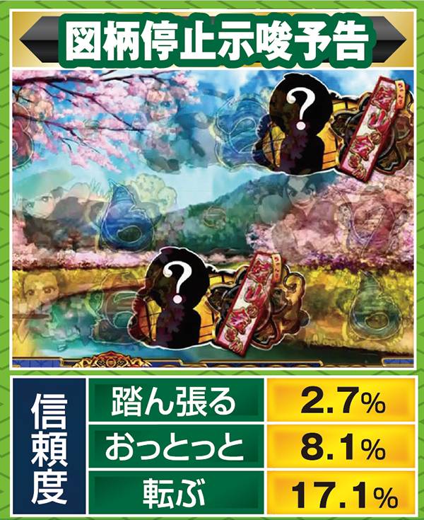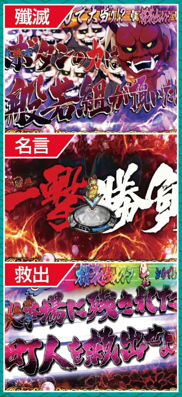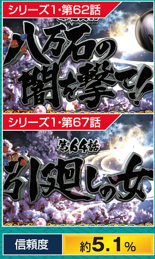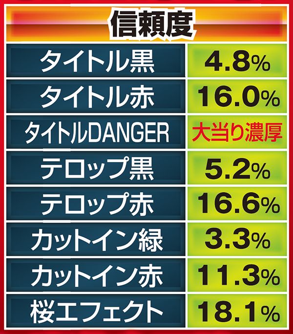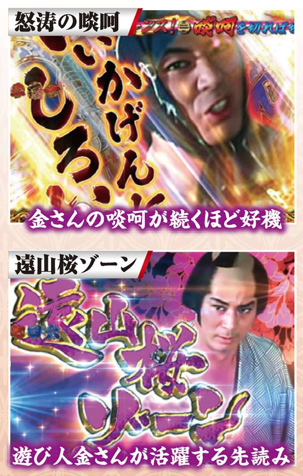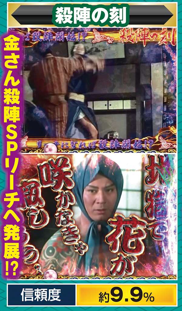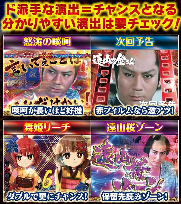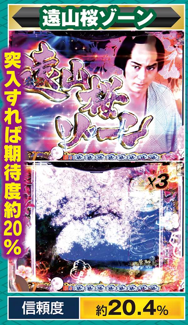 こちらの特殊ゾーンも3種類で、遠山桜ゾーンに突入すれば約5回に1回は大当りが期待できる。殺陣の刻、裁きの刻はそれぞれ対応するSPリーチ発展のチャンス。殺陣の刻の信頼度がやや低めな点には注意。