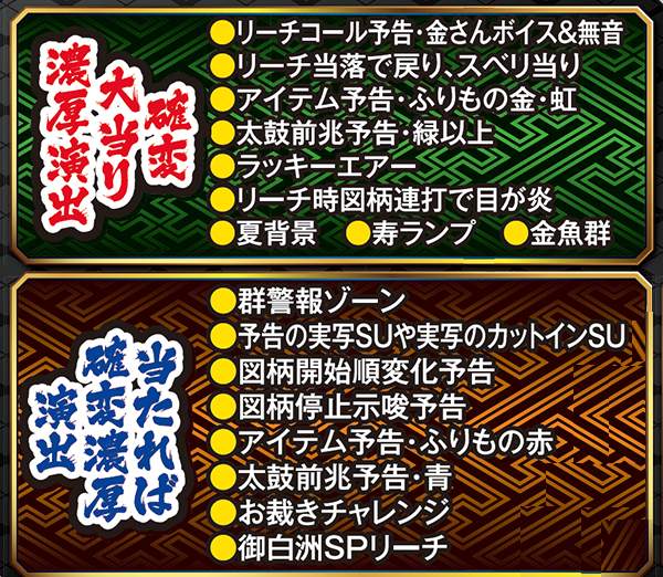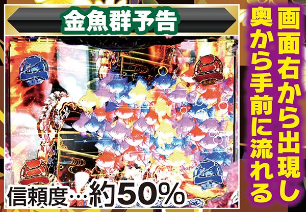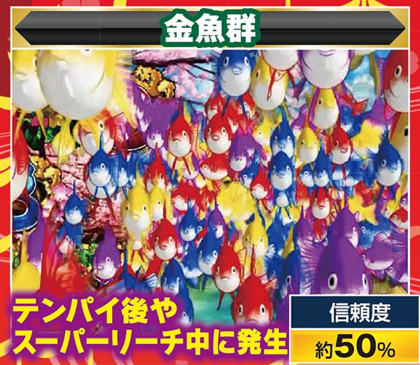 上記の予告で最注目は「怒涛の啖呵」。長く続いてからの御白洲SP発展に期待しよう。それ以外にも重要予告は豊富だ。特に両モード共通の金魚群は、出現すれば大チャンスとなるぞ。