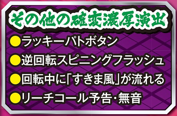 藤商事のプレミアムキャラとしてお馴染みの藤丸くん&藤香ちゃんが様々な場面に出現。また、虹系予告も多数存在するほか、回転中に「すきま風」が流れる杉良太郎モードならではの演出も。