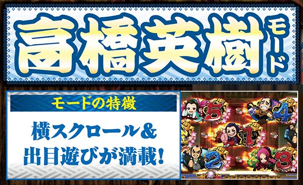 横スクロールで展開する高橋英樹モードは停止した図柄のパターンでチャンスを演出する。保留先読みや連続演出だけでなく、直接アツいリーチへ発展することも。