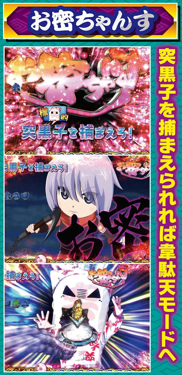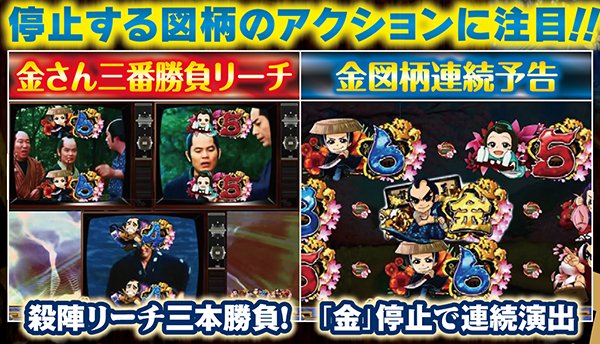 定番の群予告には金魚が登場、信頼度を大きく底上げ。トドメは名裁き展開のリーチ発展がベストだ。「お裁きチャレンジ」は実際に玉が動き、入賞する穴によってその後の展開が大きく変化するぞ。また、金さんの名場面が展開する「御白洲SPリーチ」は両モードを通じて大当りの大チャンスとなる。