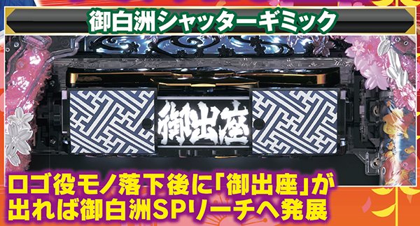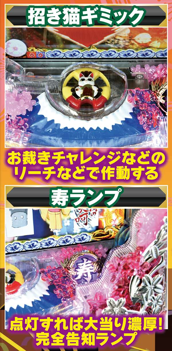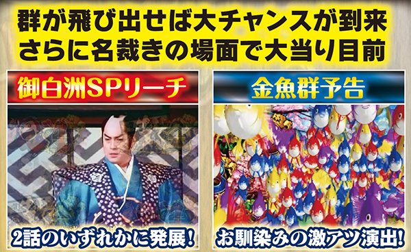 液晶上部のロゴが落下&回転し、「御出座」の文字が現れれば御白洲SPリーチへ発展。液晶右のネームプレートギミックに金魚群が停止した場合には激アツの金魚群予告が発生する。下部の招き猫ギミックは本物の玉を使ったアナログ的な演出が楽しめる。