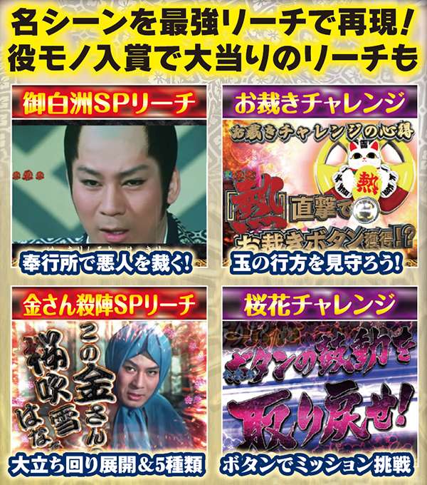 ドラマ5話分の名シーンをリーチで再現。金さんと悪党どもとの立ち回りに興奮すること間違いナシだ。
