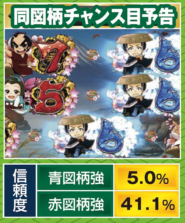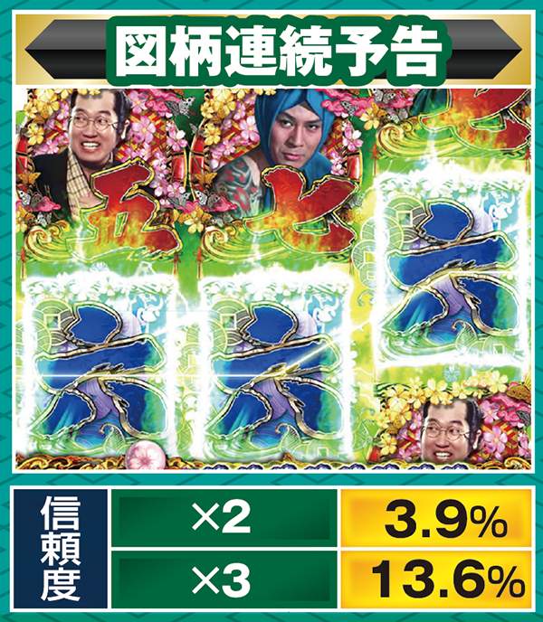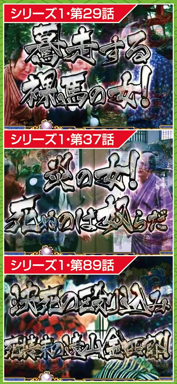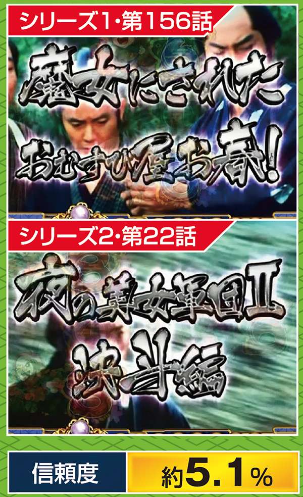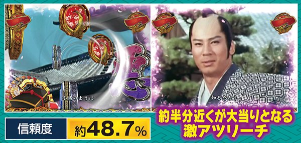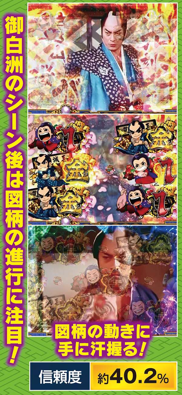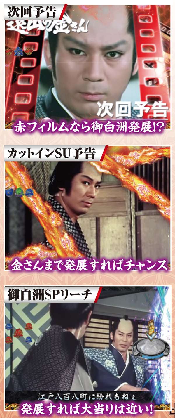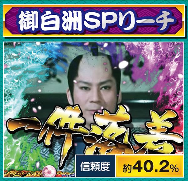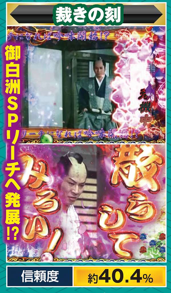 ドラマの名シーンが流れる御白洲SPリーチは2パターンで、いずれも最終的に図柄が揃えば大当り。信頼度は約40%と高く、チャンスアップが発生すればさらに期待大となる。