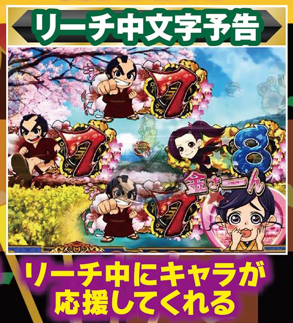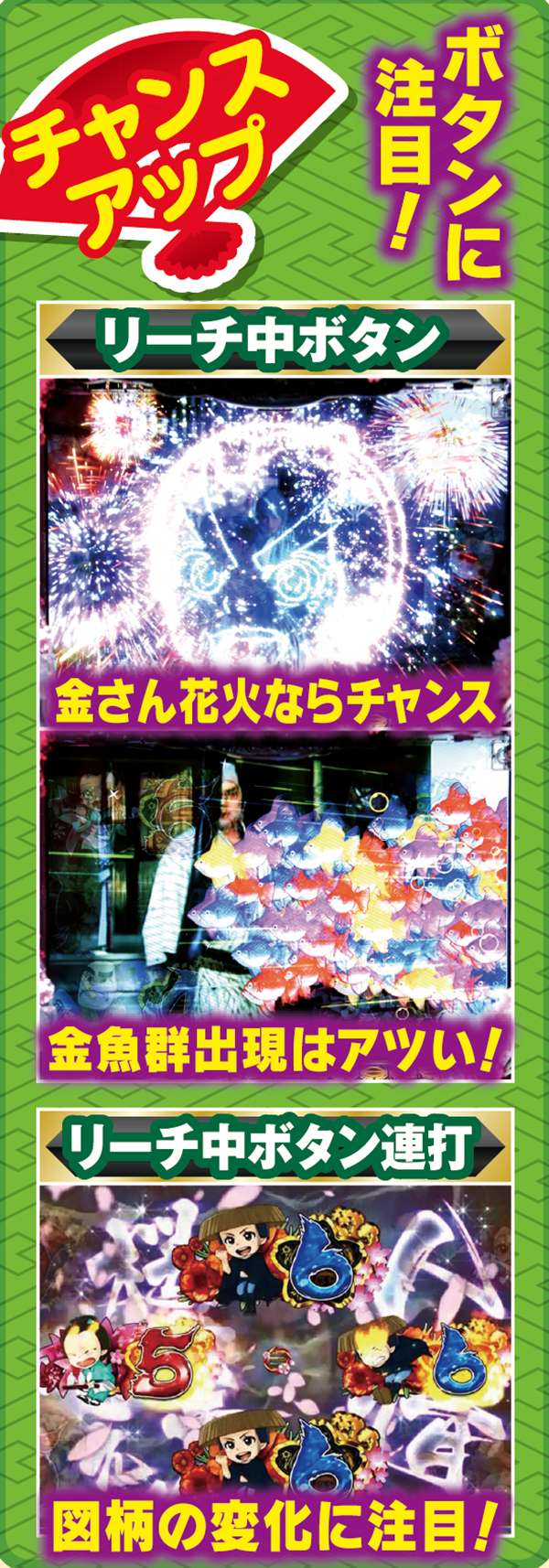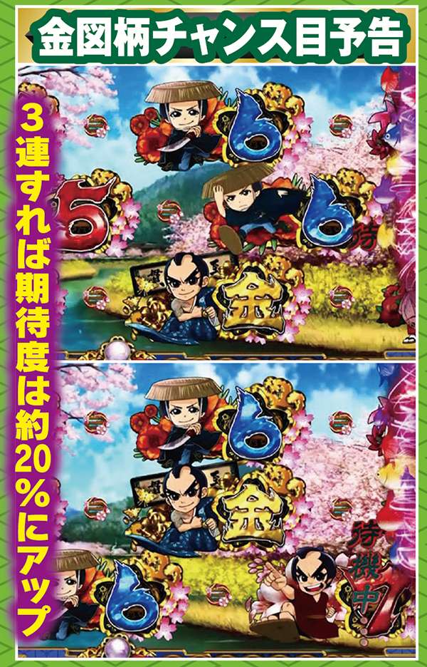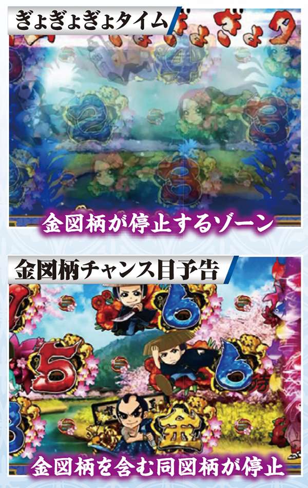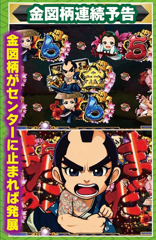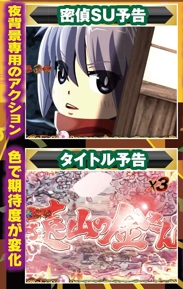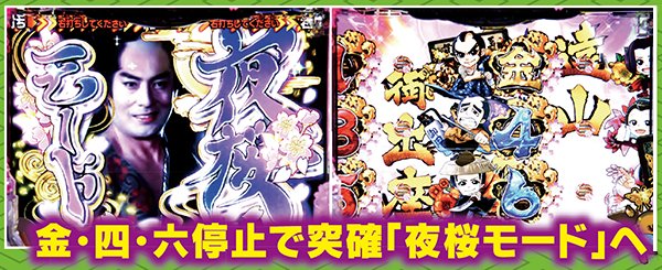 金図柄が中央に停止した場合には連続予告へ発展。チャンス目は3連続すれば信頼度がアップする。「金・4・6(きんしろう)」の出目が停止した場合には突確の夜桜モード突入となる。