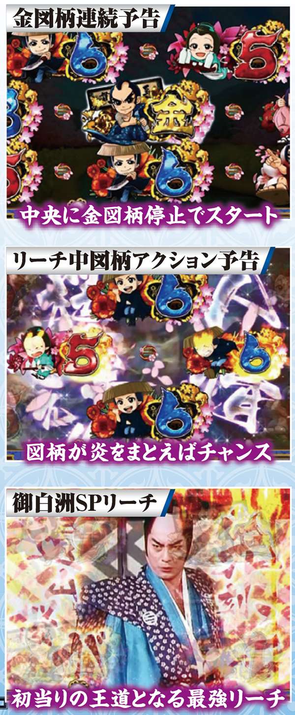金図柄停止から開始する連続予告や先読み役割を持つチャンス目など、図柄の動きが最重要。初当りは御白洲SPからが王道だが、ノーマルでもよく当たるバランスとなっている。