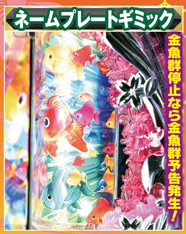 リーチ成立後やスーパーリーチ中に金魚の大群が出現すれば、約2回に1回は大当りとなる。ネームプレートにも要注目だ。