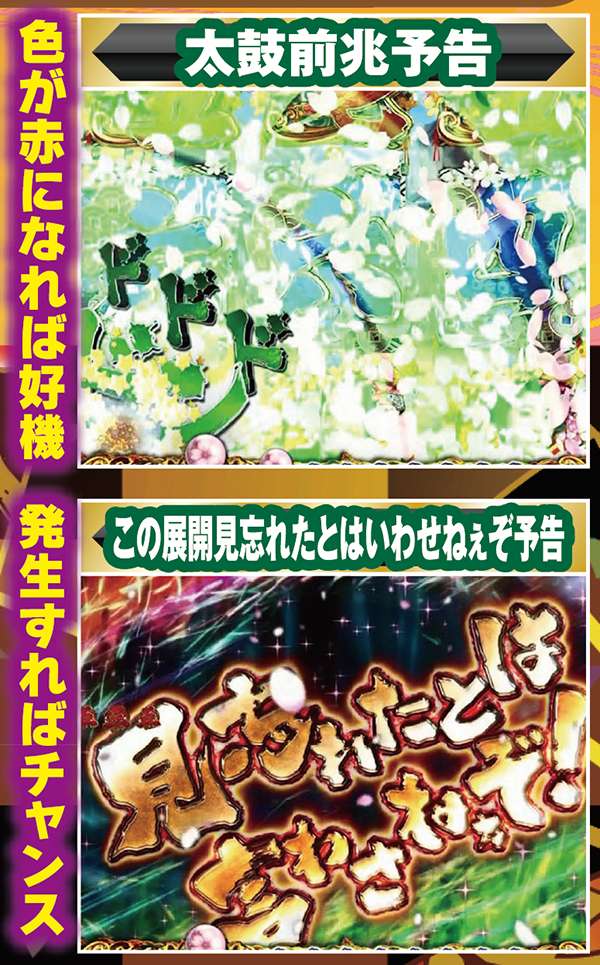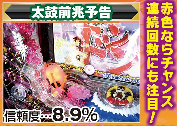 太鼓の音が鳴り響く太鼓前兆は連続すればするほど信頼度がアップ。赤色になった場合もチャンスだ。