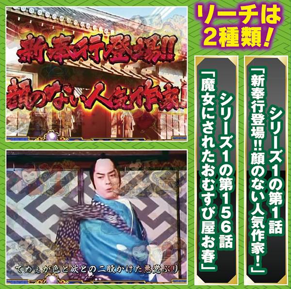 金さんが悪党と対決するシーンが流れる金さん殺陣SPリーチは全5パターン。色変化のチャンスアップに期待しよう。