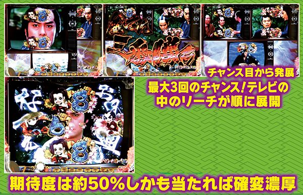 チャンス目から発展し、3つのテレビの中のアクションが順に展開されていく。信頼度が約50%の高さなうえ、当たれば確変濃厚となるのでまさに激アツだ。