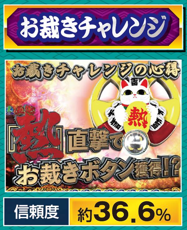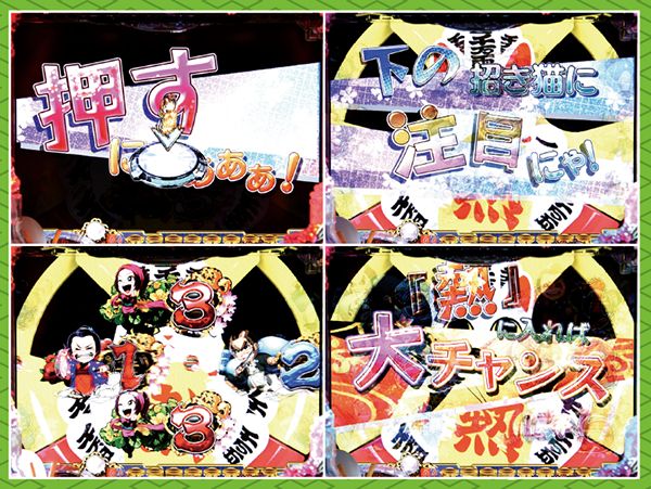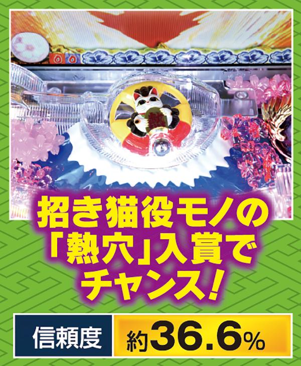 液晶下にある招き猫役モノを使ったアクションで、役モノ内回転体の「熱」と書かれた穴に玉が入ればチャンスとなる。トータル信頼度は約36.6%とまずまず期待できる。
