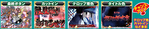 御白洲SPの信頼度を底上げしてくれるのがチャンスアップパターン。タイトルやテロップの帯色、終盤のカットイン、最終段階でのボタンなど、リーチ中の様々なポイントで発生する。また、最終ボタン以外は金さん殺陣SPでも発生する。