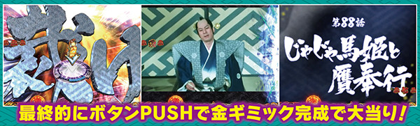 金さんが悪人を裁く御白洲SPリーチは「燃えろ桜吹雪」と「じゃじゃ馬姫と贋奉行」の2パターンで、最終的に金ギミックが完成すれば大当り。トータル信頼度は40%オーバーの高さだ。