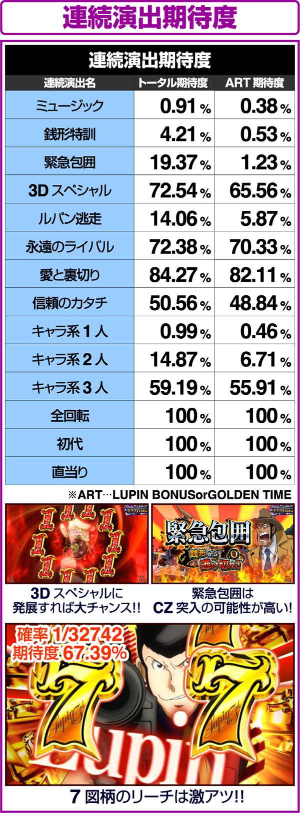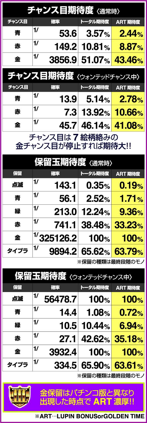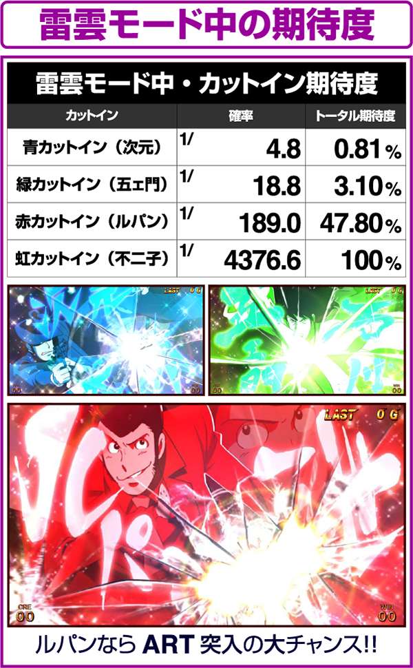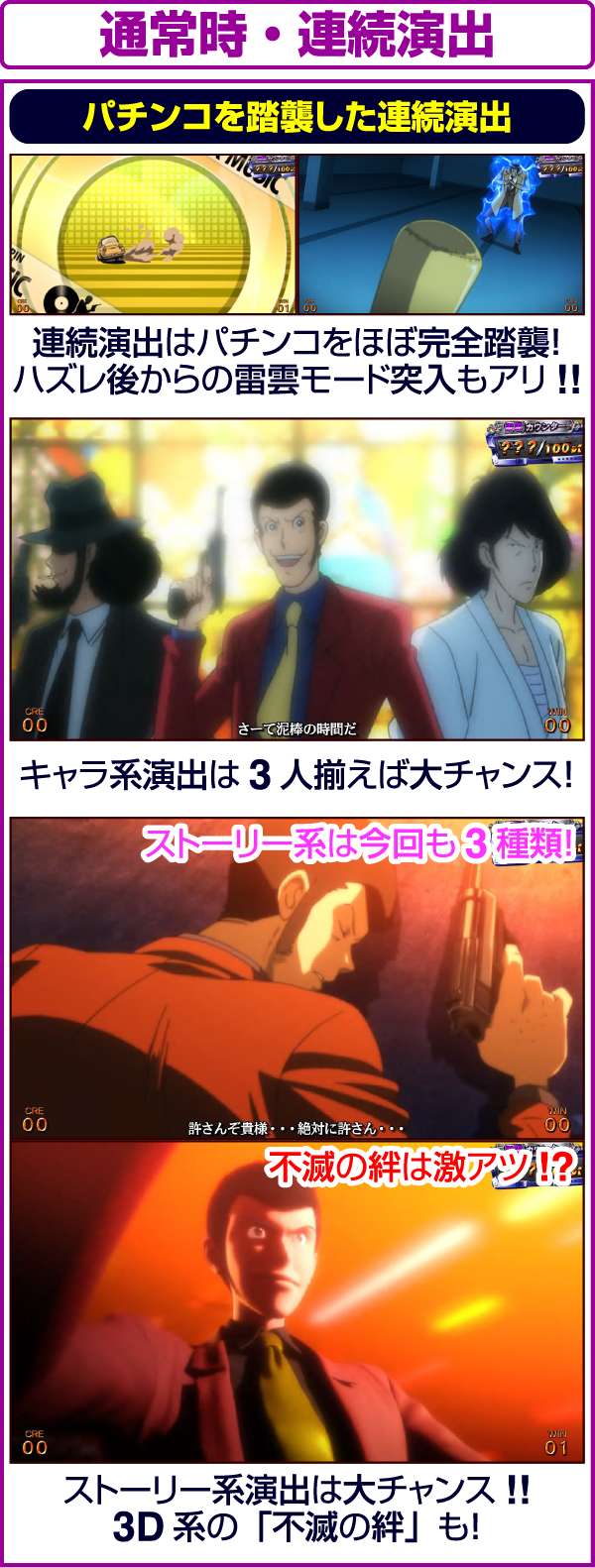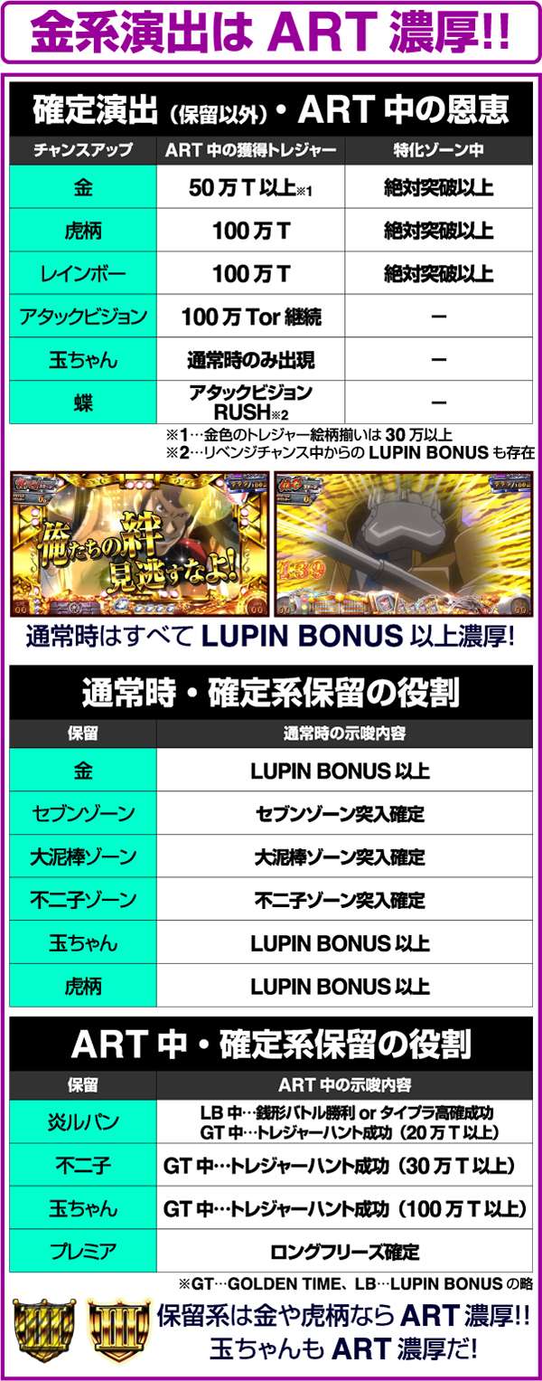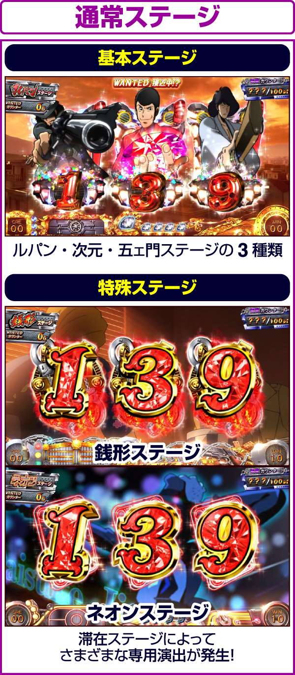 大ヒットとなったパチンコ「CRルパン三世〜消されたルパン〜」の演出を踏襲した純増約2.0枚/1GのART機。 通常時は規定ゲーム数消化でCZが、レア役によってCZとARTが抽選される。 まずはCZやレア役でルパンボーナスや雷雲モードに当選させ、そこからループ率80%のART・GOLDEN TIMEを目指すという流れがゲームの主軸となる。 |