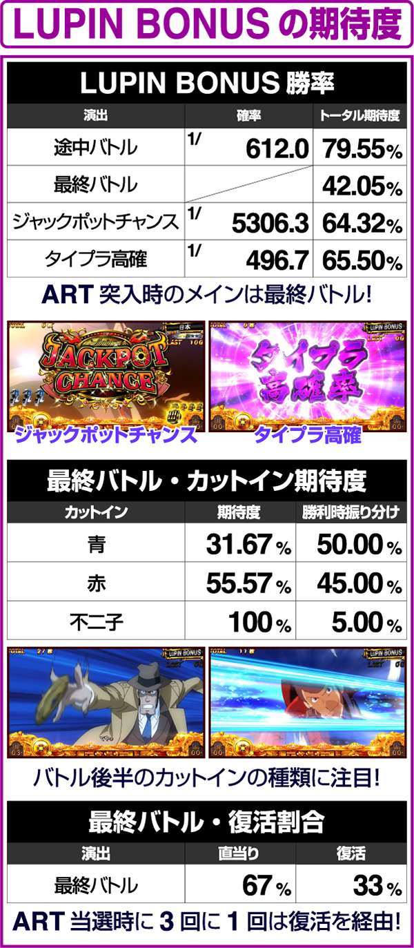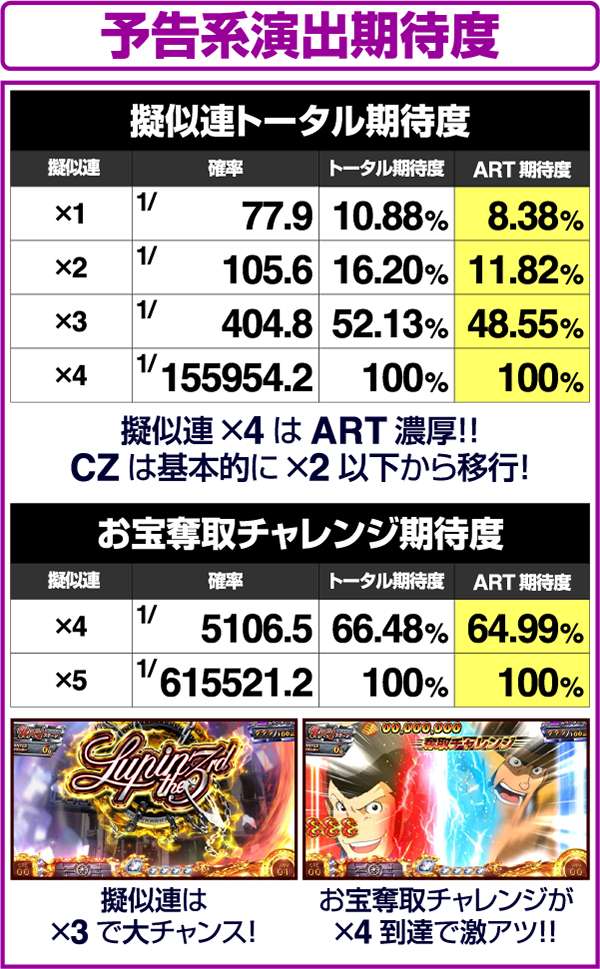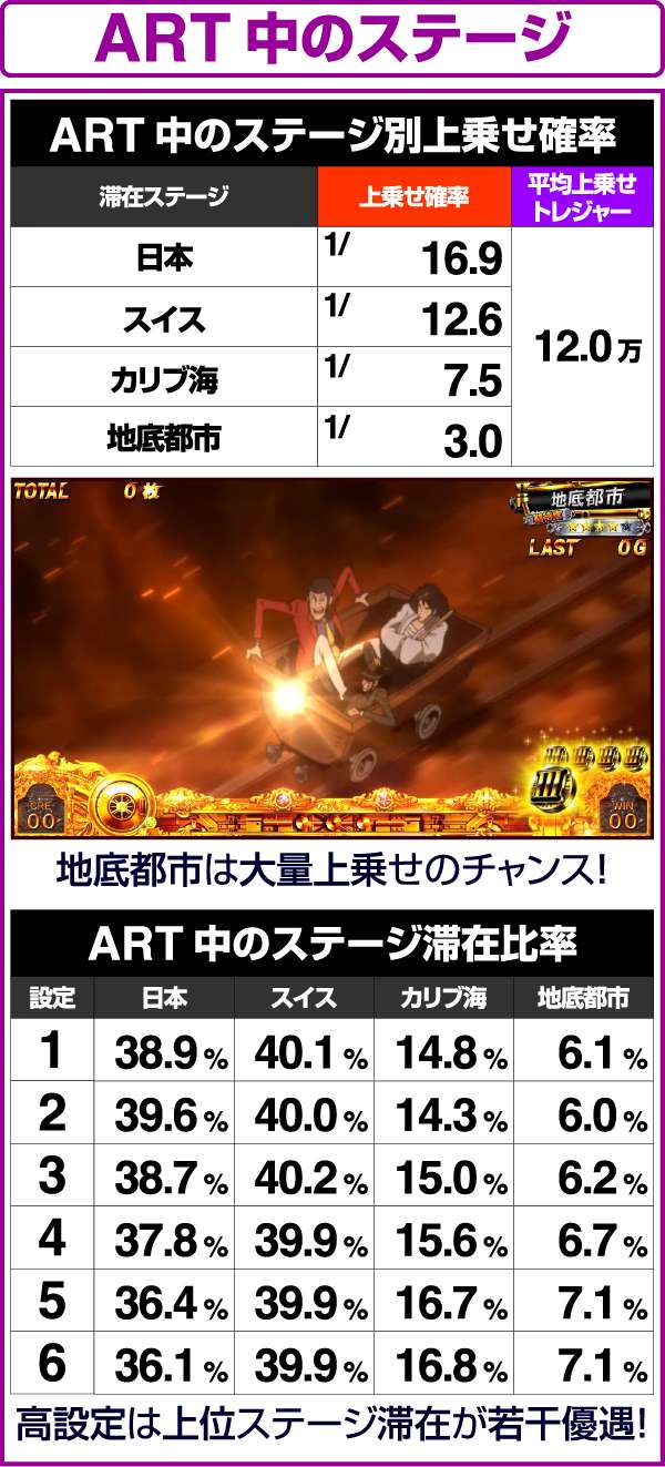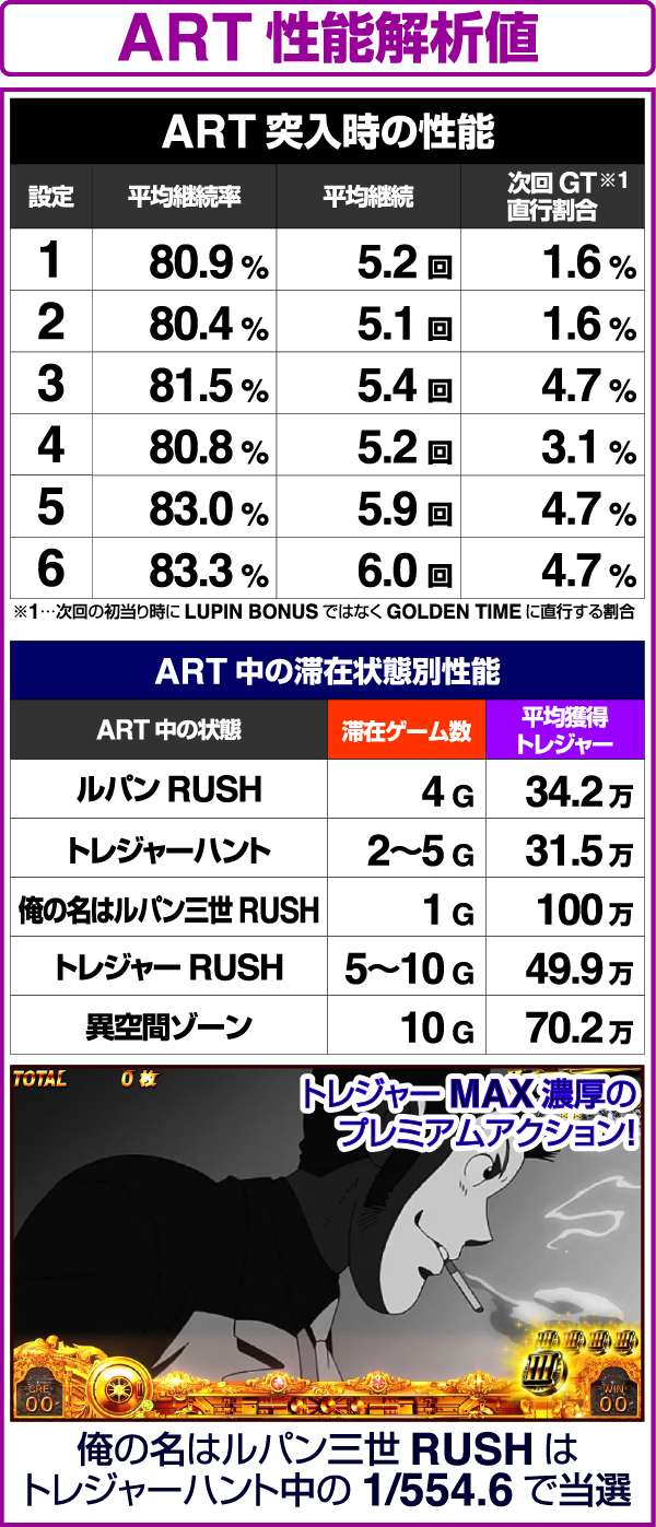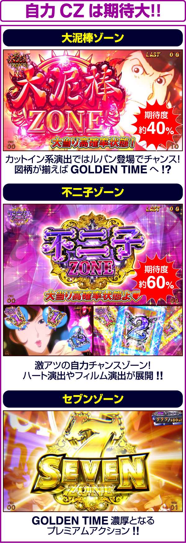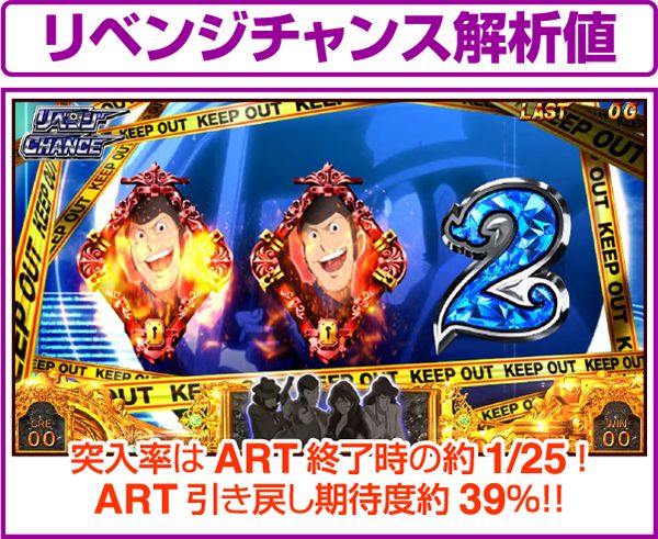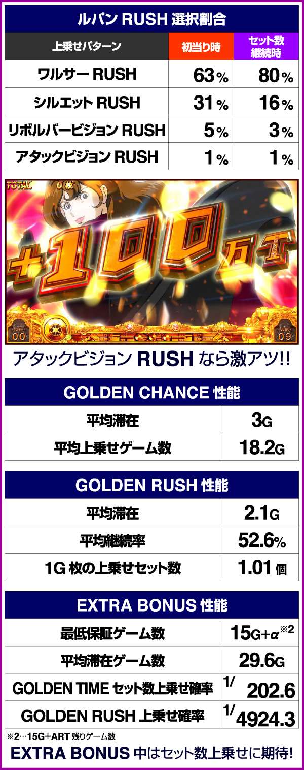 大ヒットとなったパチンコ「CRルパン三世〜消されたルパン〜」の演出を踏襲した純増約2.0枚/1GのART機。 通常時は規定ゲーム数消化でCZが、レア役によってCZとARTが抽選される。 まずはCZやレア役でルパンボーナスや雷雲モードに当選させ、そこからループ率80%のART・GOLDEN TIMEを目指すという流れがゲームの主軸となる。 |