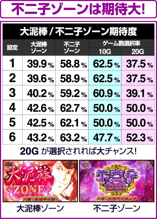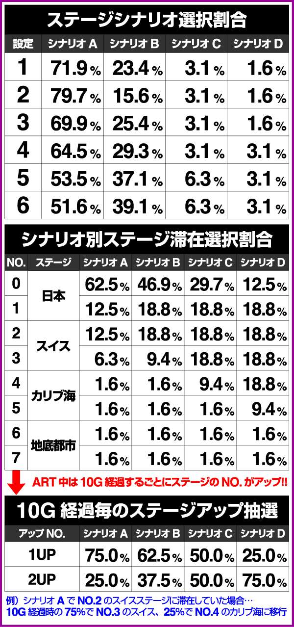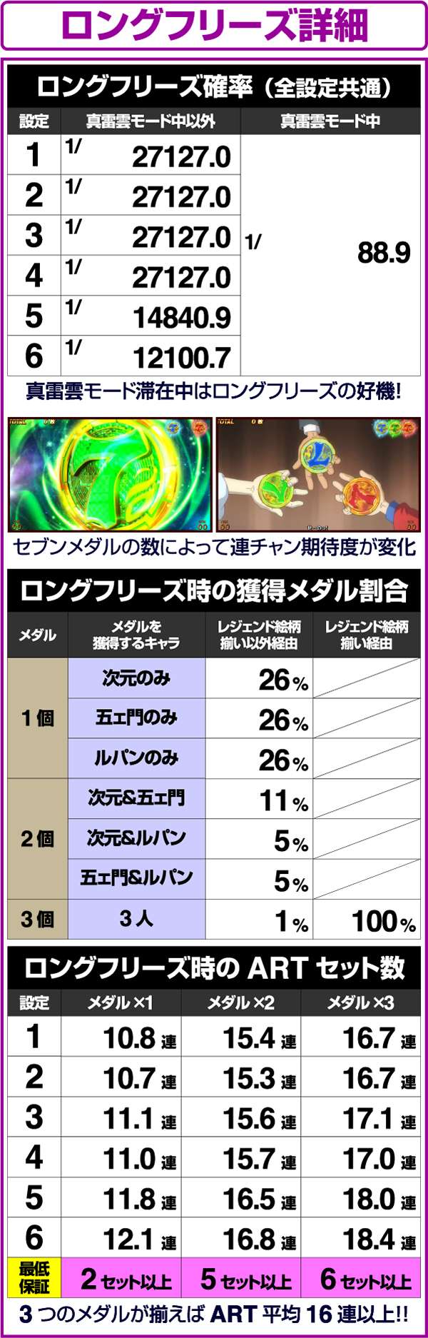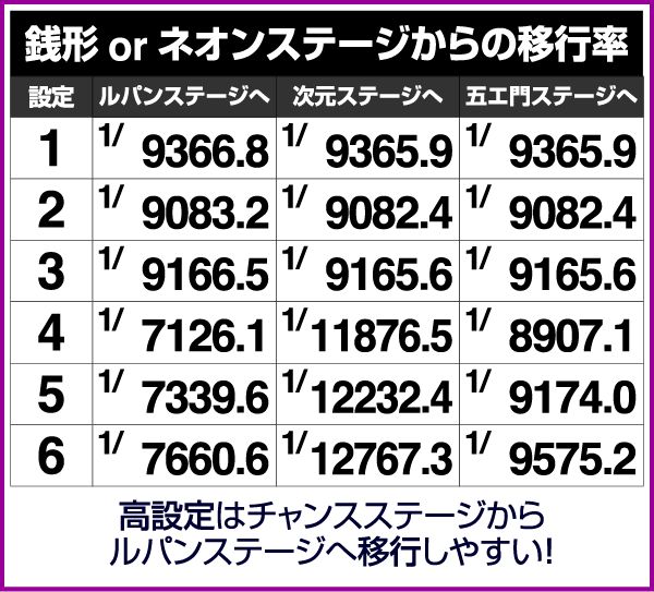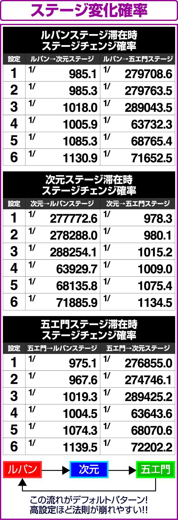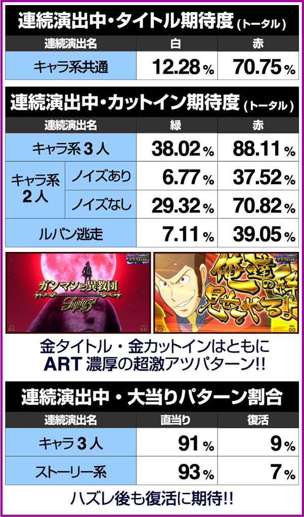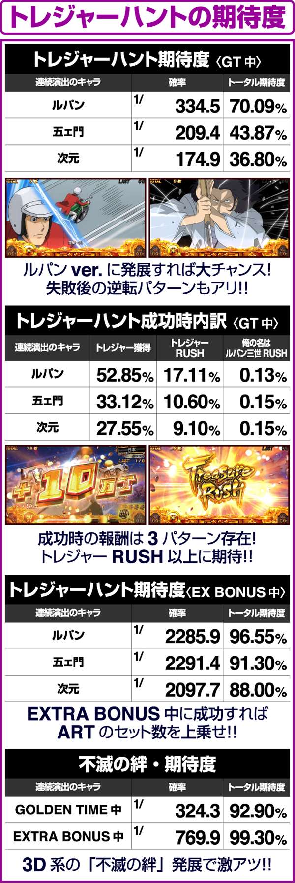 大ヒットとなったパチンコ「CRルパン三世〜消されたルパン〜」の演出を踏襲した純増約2.0枚/1GのART機。 通常時は規定ゲーム数消化でCZが、レア役によってCZとARTが抽選される。 まずはCZやレア役でルパンボーナスや雷雲モードに当選させ、そこからループ率80%のART・GOLDEN TIMEを目指すという流れがゲームの主軸となる。 |
