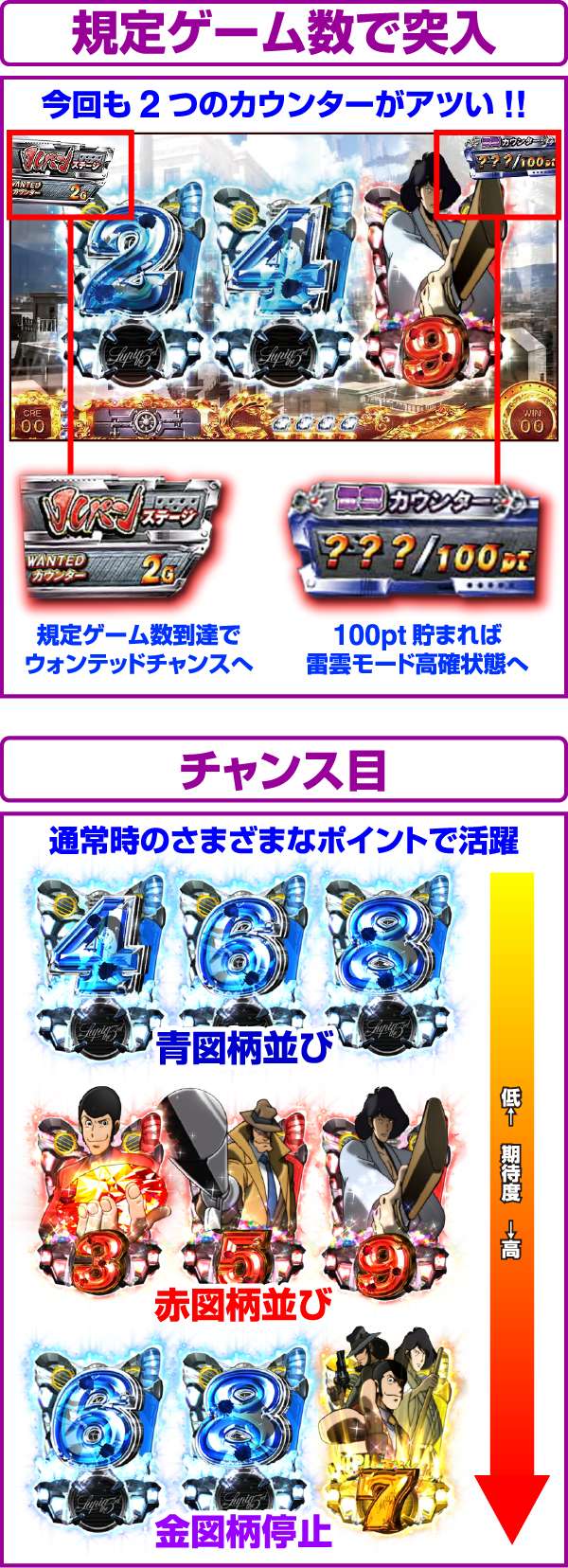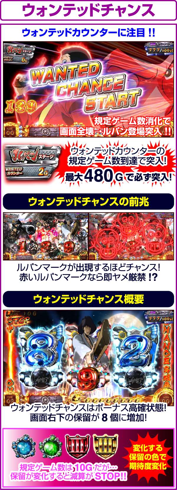 ウォンテッドチャンスの規定ゲーム数は10Gだが、チャンス目を引いて保留が変化すれば、その保留を消化するまでゲーム数の減算がSTOPするため、ヒキ次第ではロング継続にも期待できる。