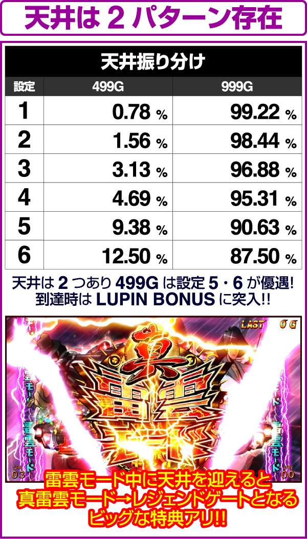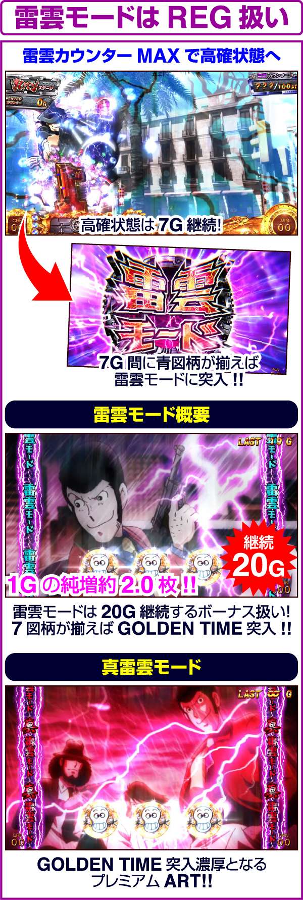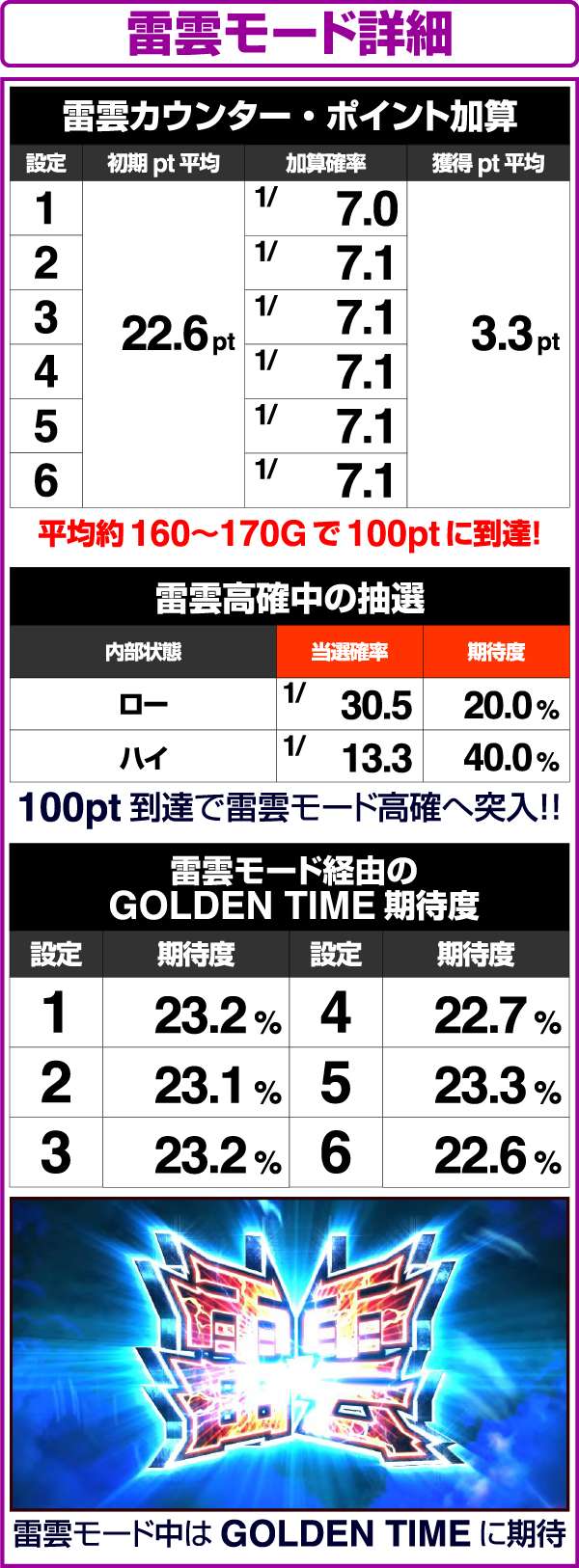 雷雲モード自体は20G間継続するREG的な存在となっており、消化中に7図柄が揃えばGOLDEN TIMEに突入。