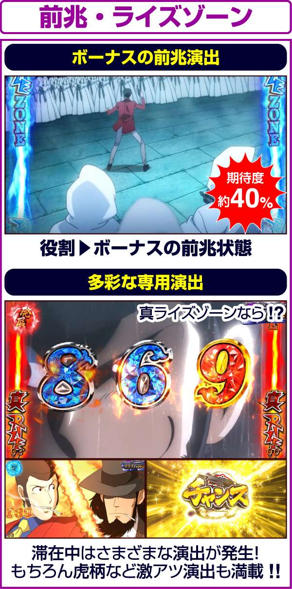 ライズゾーンは高期待度の前兆状態となっており、ボーナス期待度は約40%。