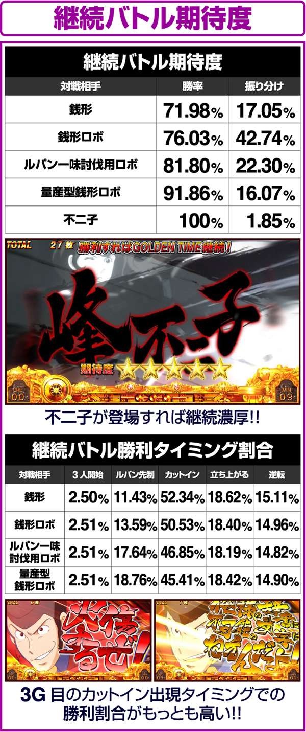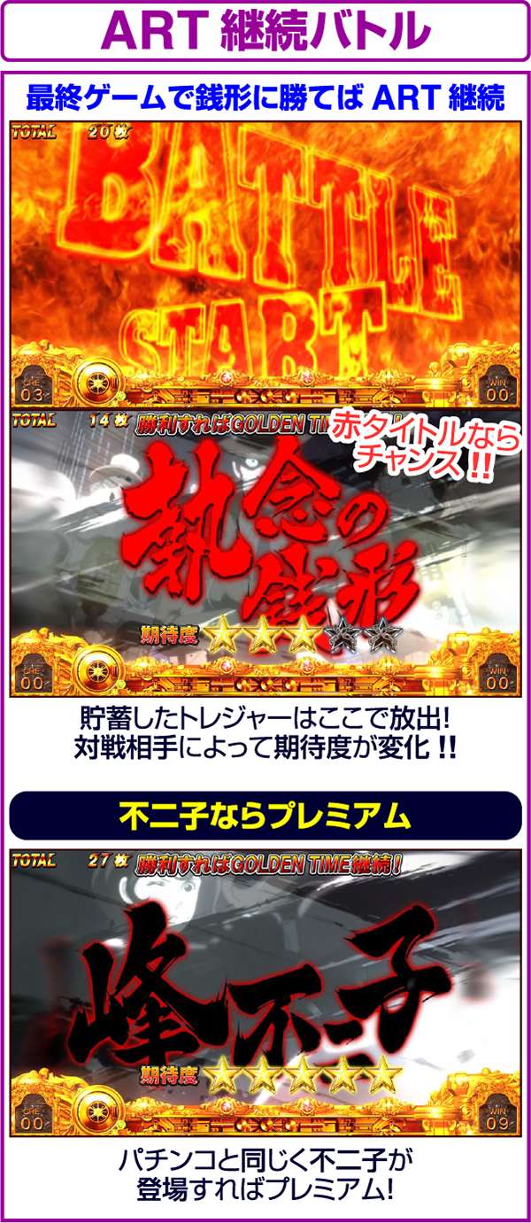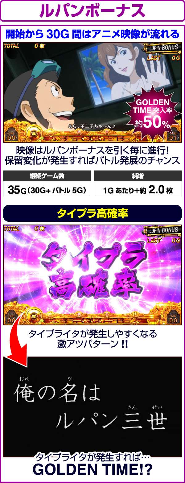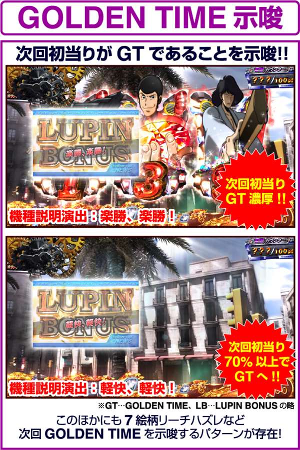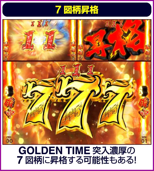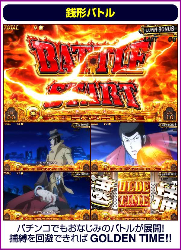 ルパンボーナス中はGOLDEN TIME突入の成否が抽選されており、ラスト5G間で展開する銭形バトルで勝利すればGOLDEN TIME突入。