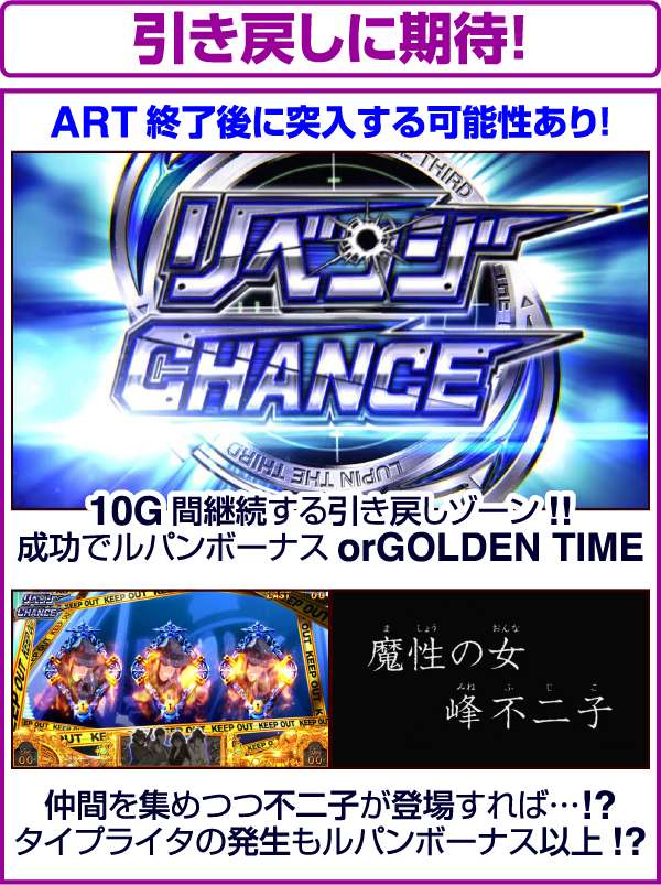 リベンジチャンスはLUPIN BONUS引き戻しの高確率ゾーン。やや低確率ではあるがGOLDEN TIMEに直行するパターンもある。