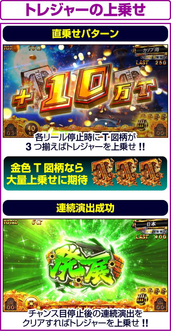 ART中はT図柄揃いやチャンス目を契機にトレジャーが上乗せされる。T図柄は銀と金の2種類があり、金が揃えば大量ポイントゲットに期待できる。