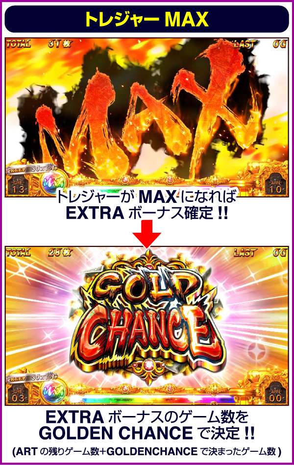 最終的にGOLDEN CHANCEで決まったゲーム数と、ARTの残りゲーム数がEXTRAボーナスのゲーム数となる。